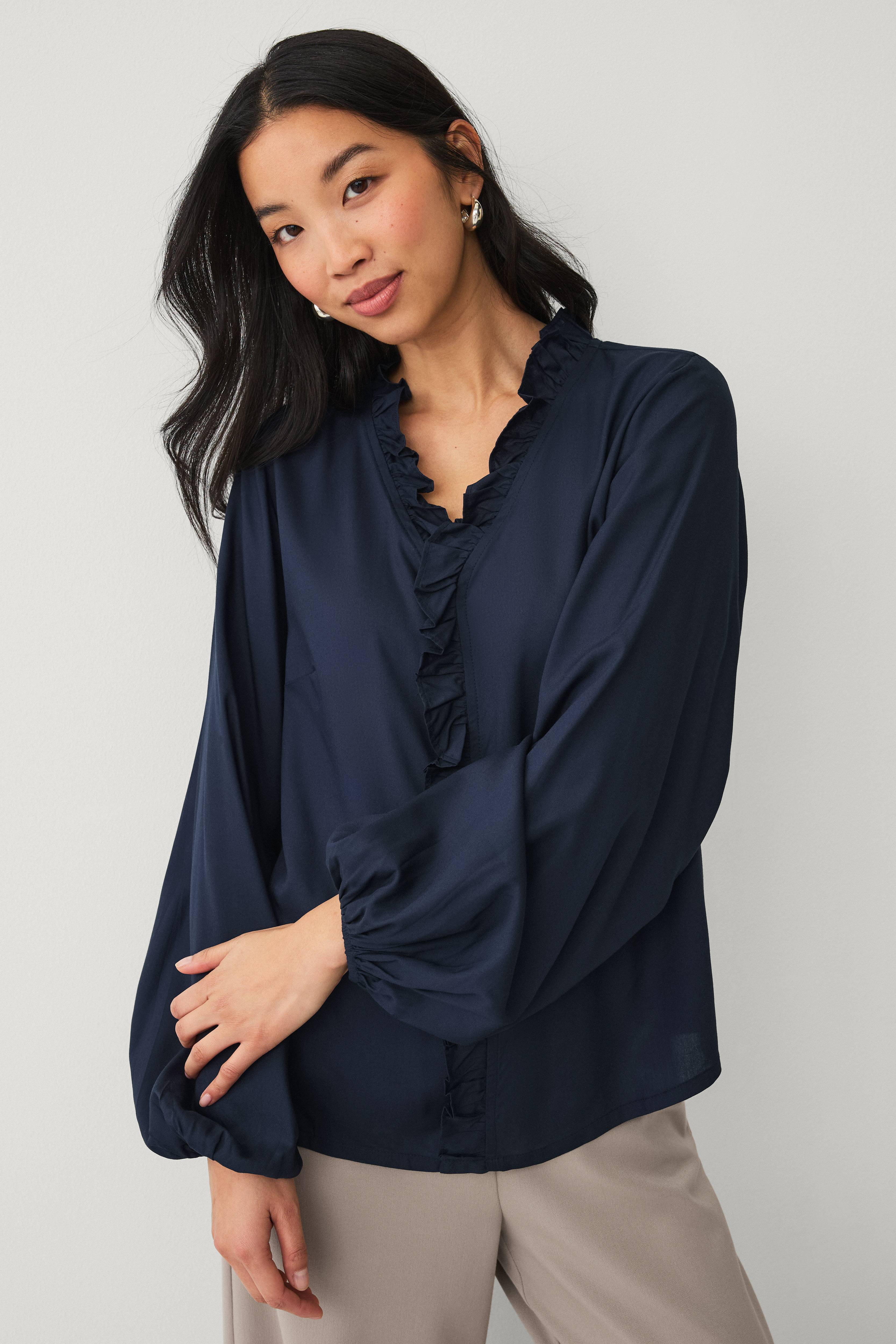 • Bluse i viskose • Volant rundt om halsudskæringen og ved fronten • Lange ærmer med elastik ved manchetterne • V-formet halsudskæring • Længde: 61 cm i størrelse 36