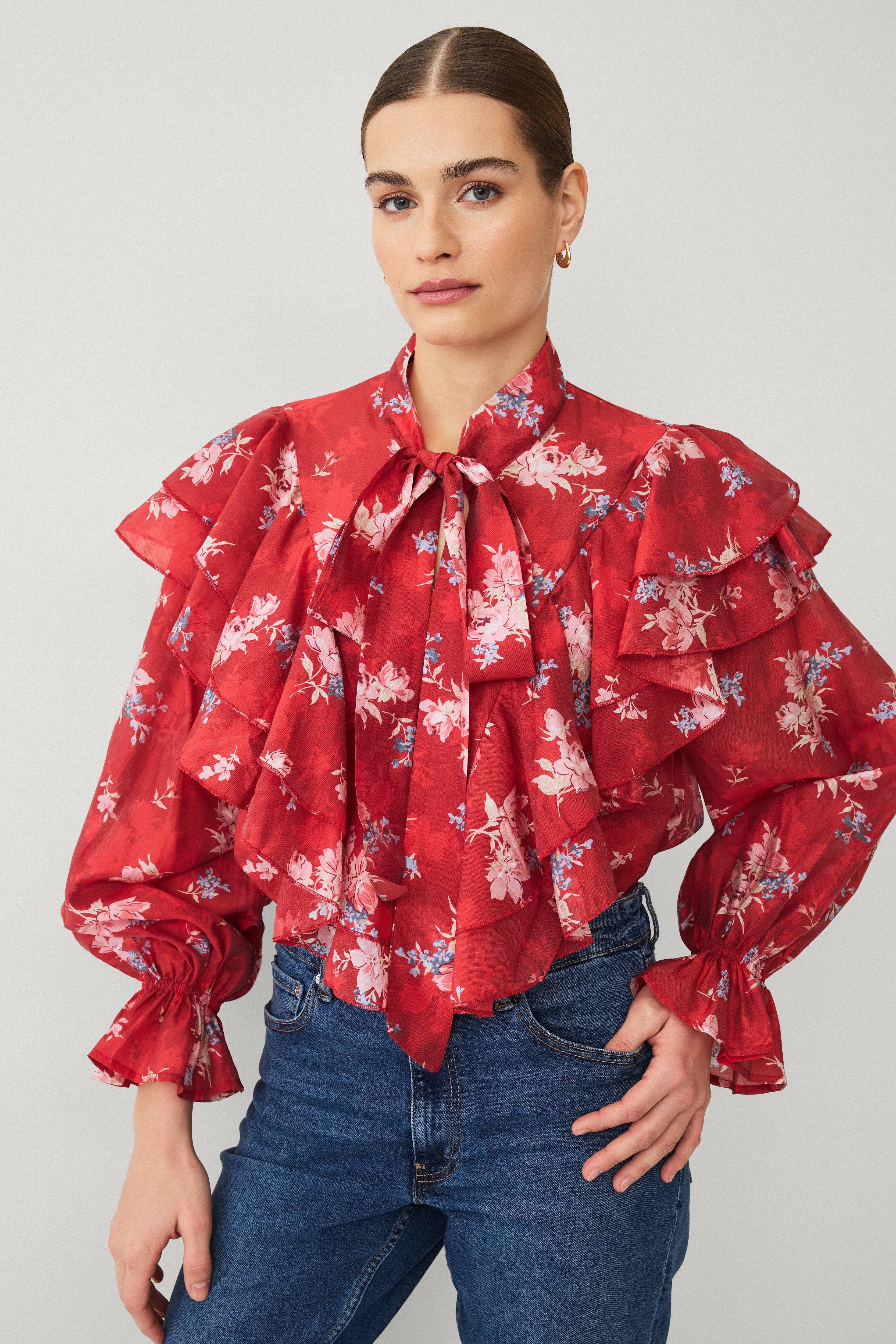 • Langærmet, semitransparent bluse i chiffon• V-formet halsudskæring med bindebånd foran• Dekorative volanter hele vejen rundt• Ballonærmer med elastik og volant ved manchetterne• Længde: 66 cm i størrelse S