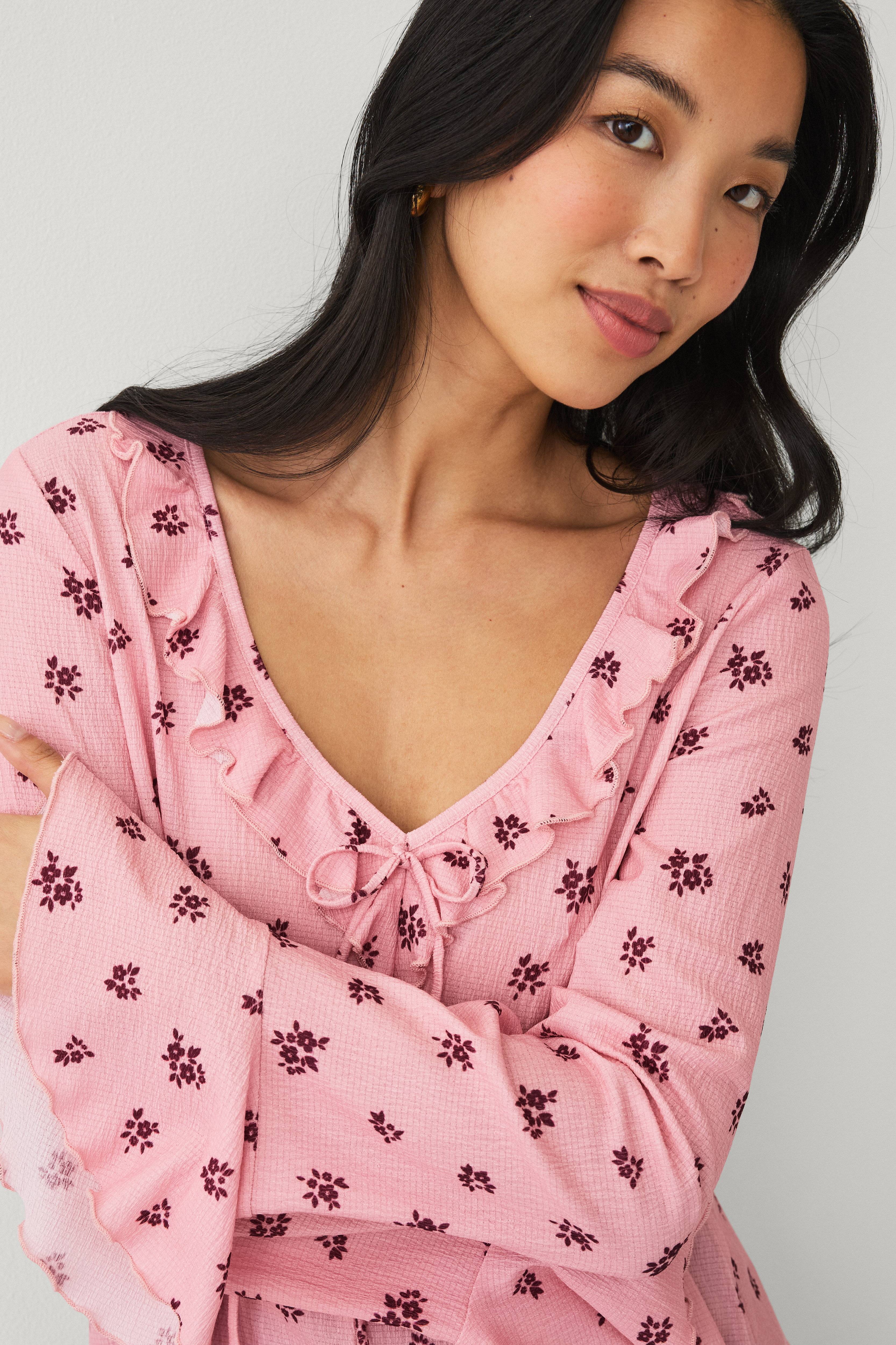 • Tynd, mønstret bluse med let krøllet struktur• V-formet halsudskæring med volant hele vejen rundt og dekorativt bindebånd• Lange ærmer med volant ved manchetterne• Længde: 56 cm i størrelse S