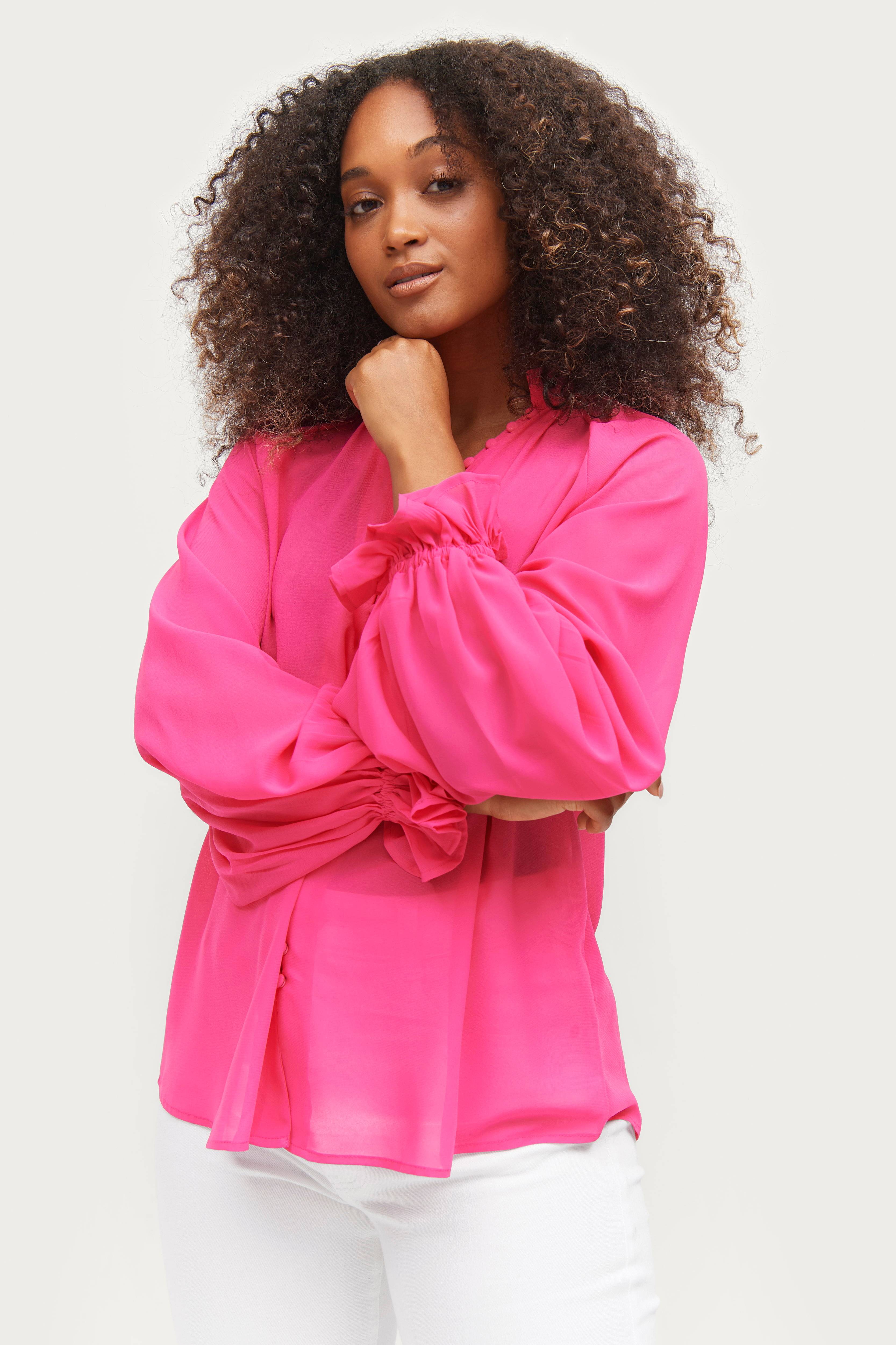 Sidder meget flot på kroppen, smukt mønstret chiffon, flotte manchetter. Jeg føler mig smuk i det. Bliver efterårets go-to-bluse til begivenheder.