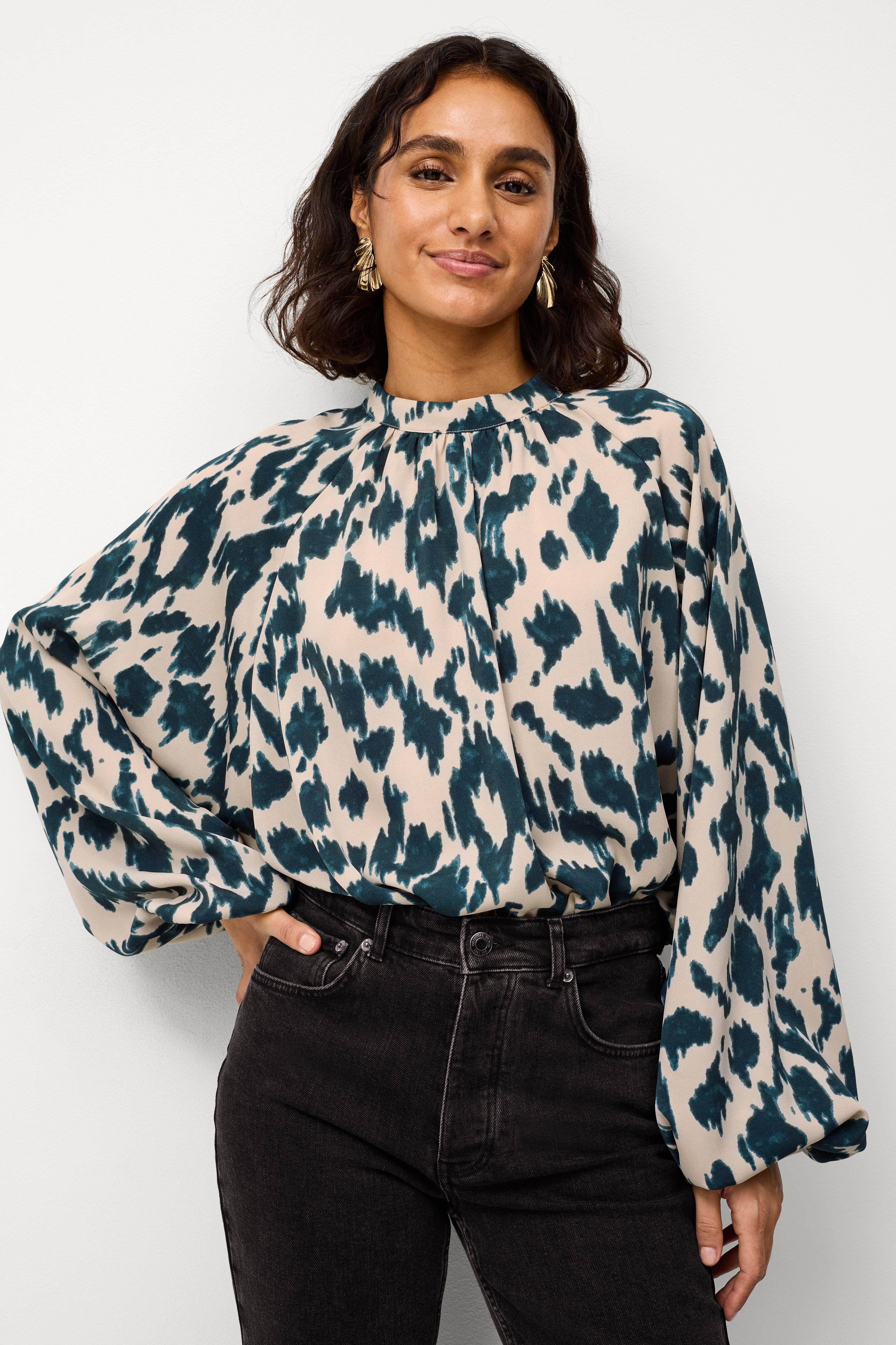 • Bred model med svaj i chiffon • Halvhøj krave med knapper i nakken • Ekstra bredt ærme med elastisk manchet • Afrundet søm med længere bagside • Længde: 76 cm i størrelse 34/36