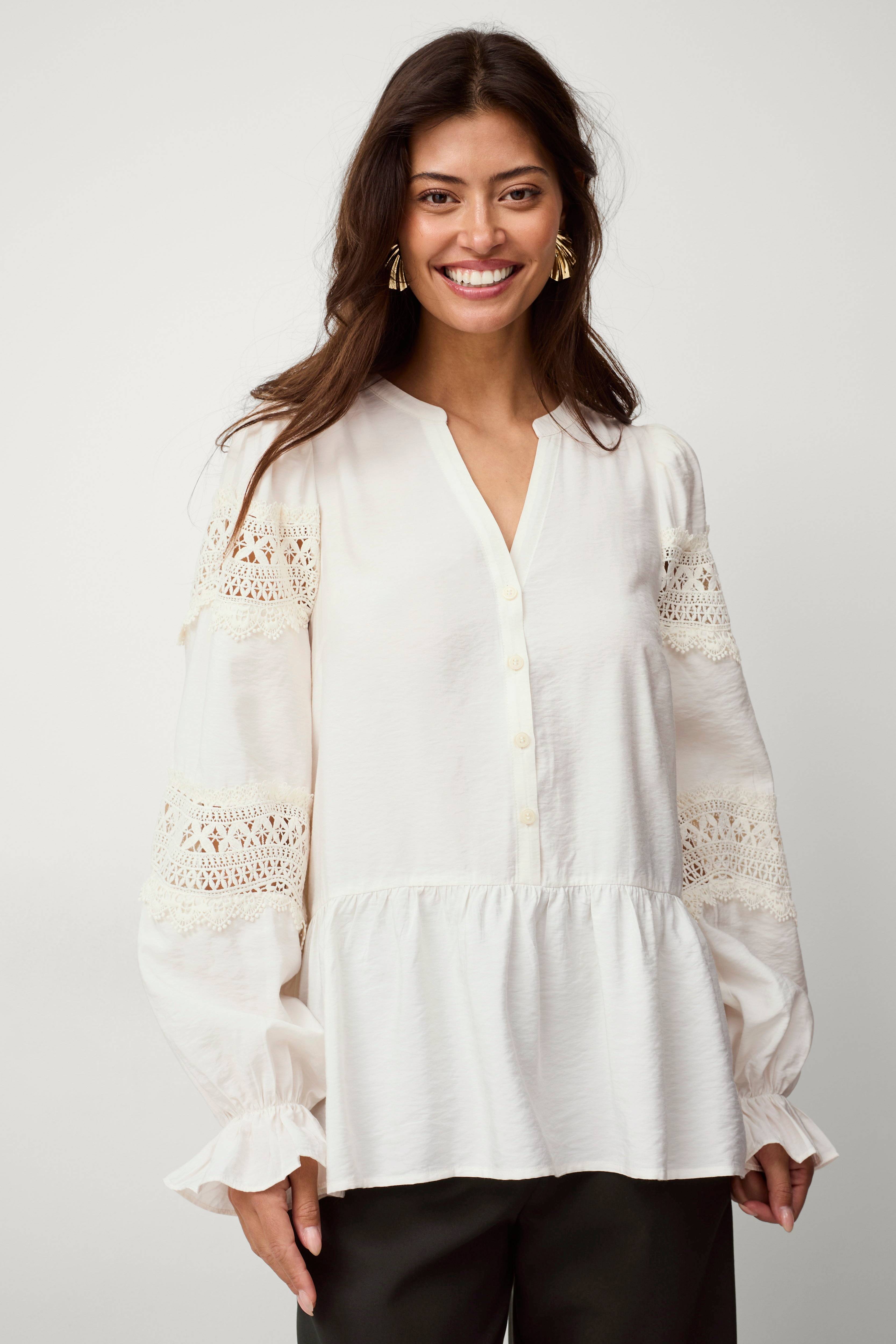 • Brede ballonærmer med blondedetaljer og volant ved manchetterne• V-udskæring• Knapper foran• Rynket udskæring ved taljen• Længde: 70 cm i størrelse 34/36