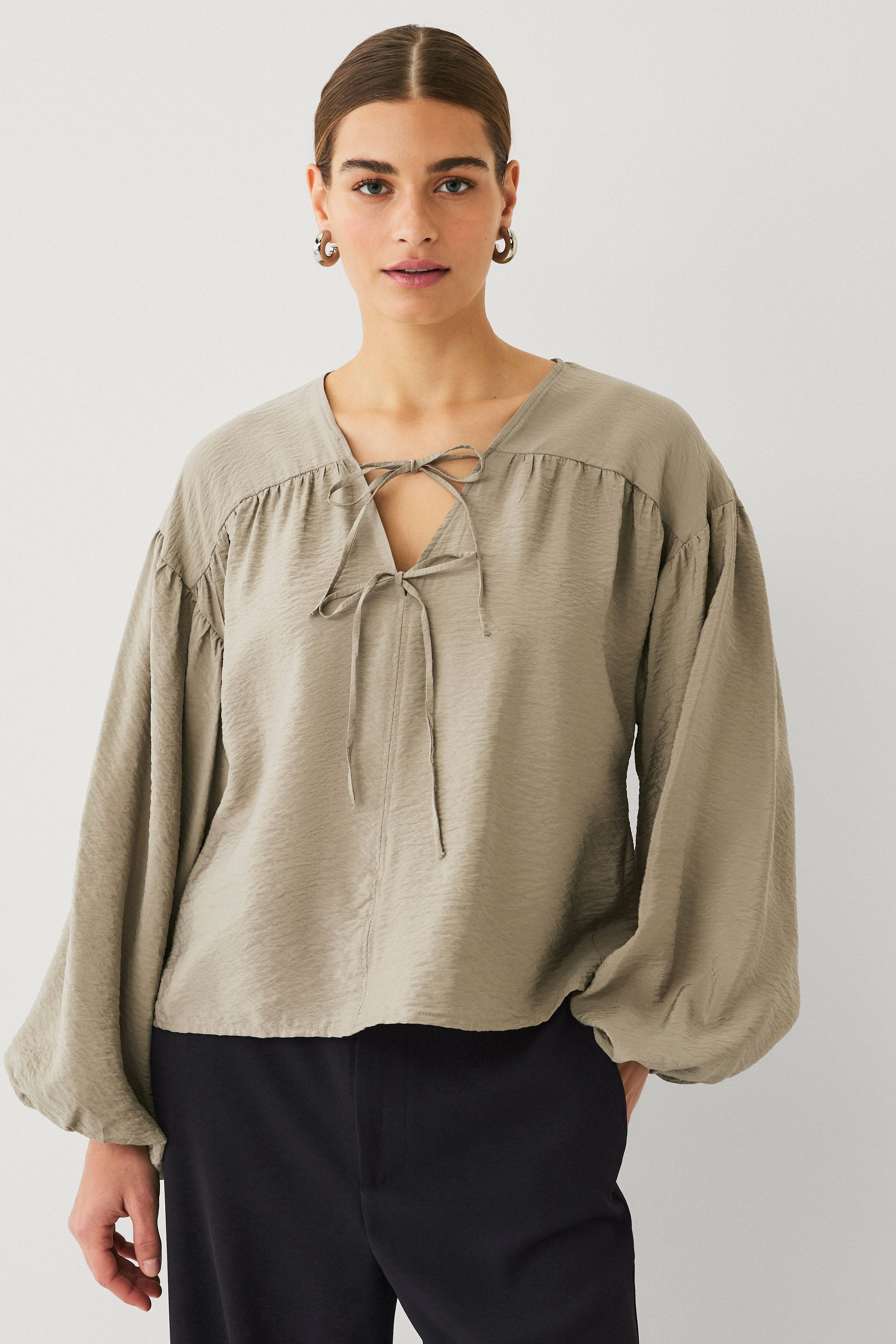 • Bluse i let, luftigt materiale• Ballonærmer med elastik ved manchetterne og nedsænkede skuldre• Plisseret design ved brystet• V-formet halsudskæring med to dekorative bindebånd foran• Længde: 60 cm i størrelse S