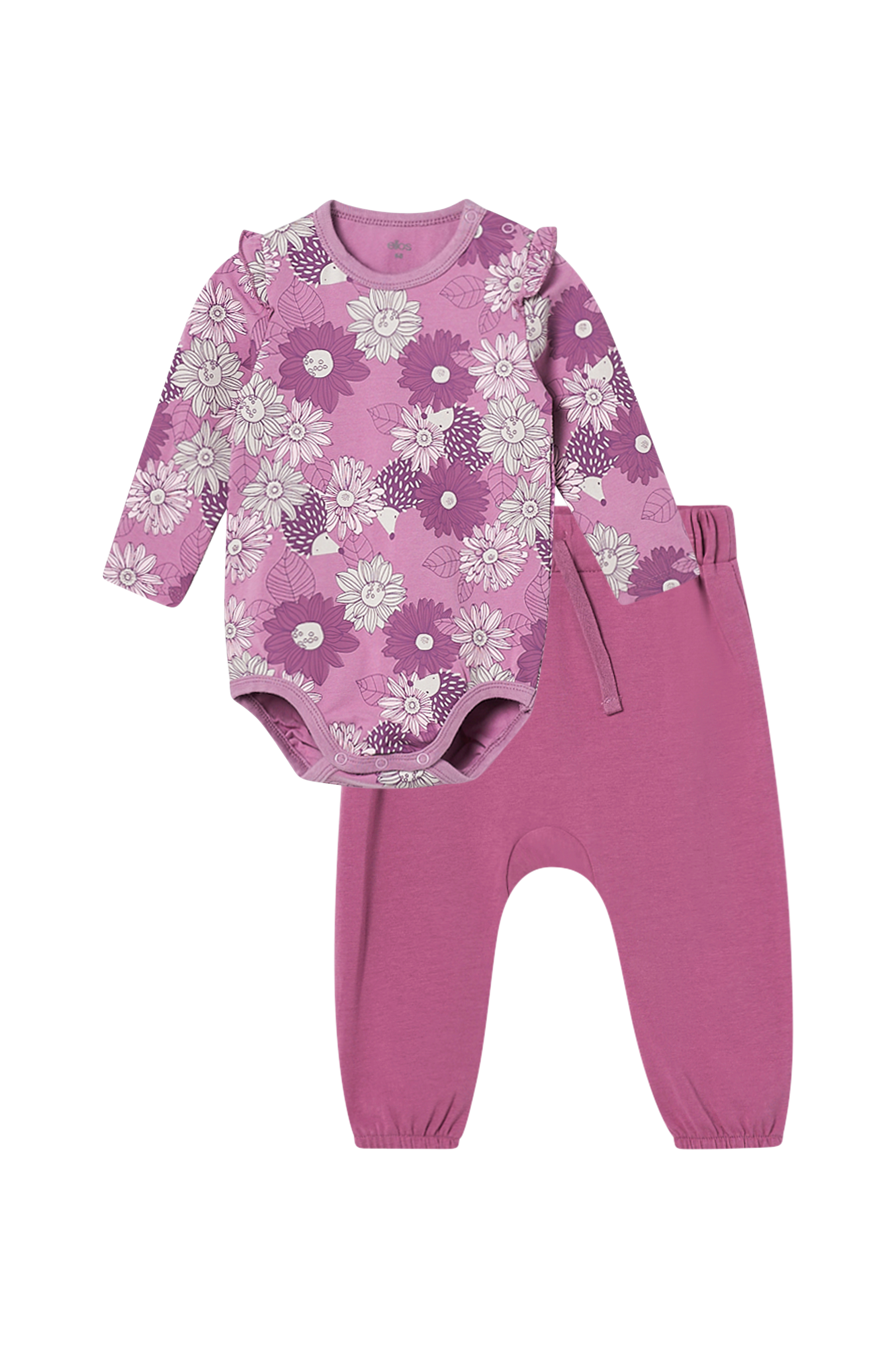 • Todelt sæt i bomuldsjersey • Langærmet body med trykknapper ved skulderen og ved skridtet • Bukser med træksnørre ved taljen og elastisk bånd ved enden af benene • Produktet indeholder økologisk bomuld, som er dyrket uden kemiske sprøjtemidler, kunstgødning og genmodificerede afgrøder (GMO). Dette betyder et sundere arbejdsmiljø for landmænd og bedre jord.