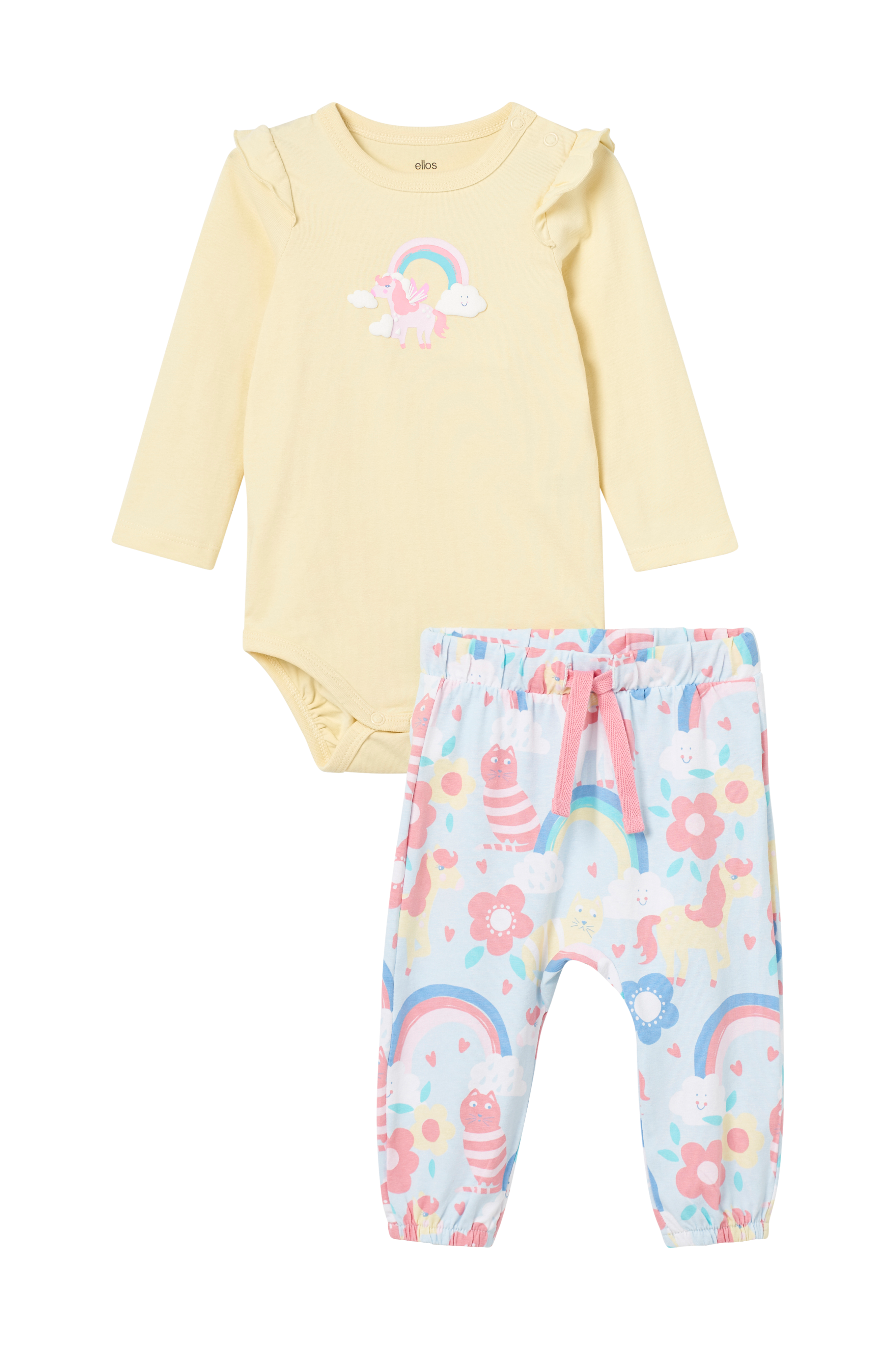 • Todelt sæt i bomuldsjersey• Langærmet body med trykknapper ved skulderen og ved skridtet• Volanter omkring skuldrene• Bukser med elastisk talje med træksnørre• Elastisk bånd ved enden af benene