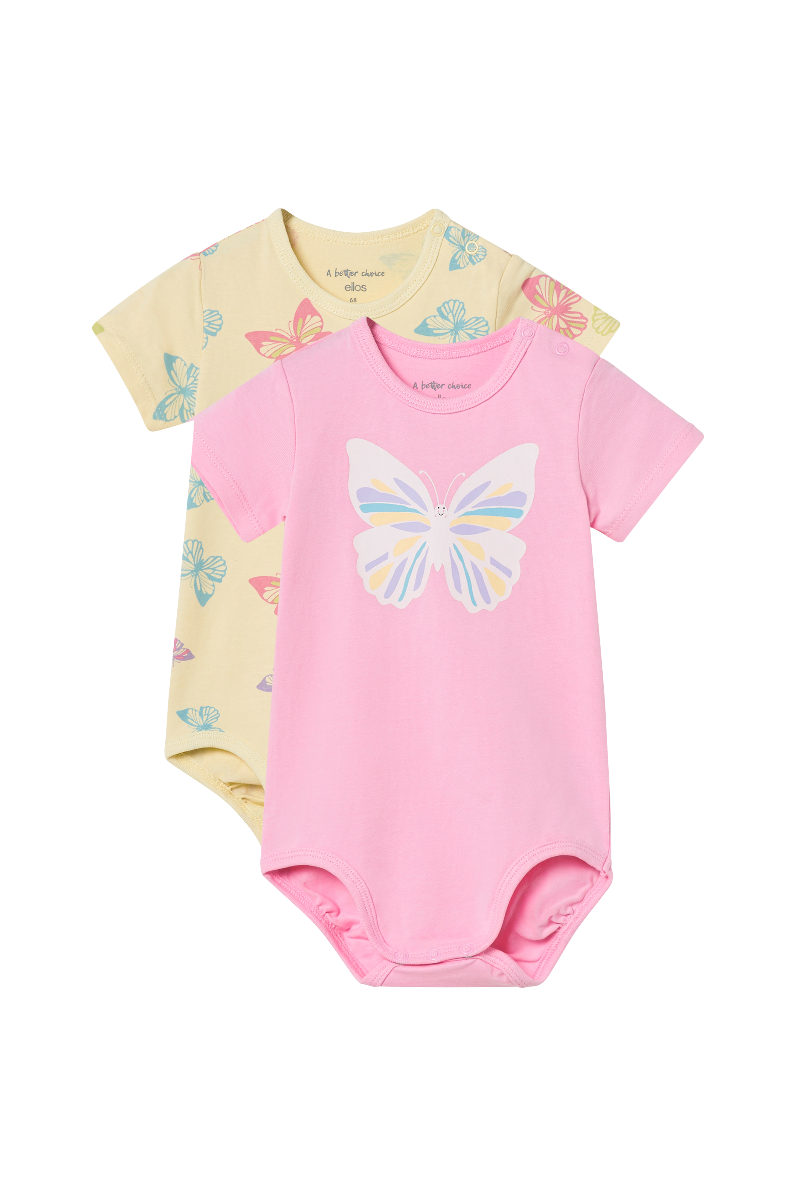 Kortærmet body i 2-pak med rund halsudskæring. Af blød bomuld. Trykknapper på den ene skulder og i skridtet.