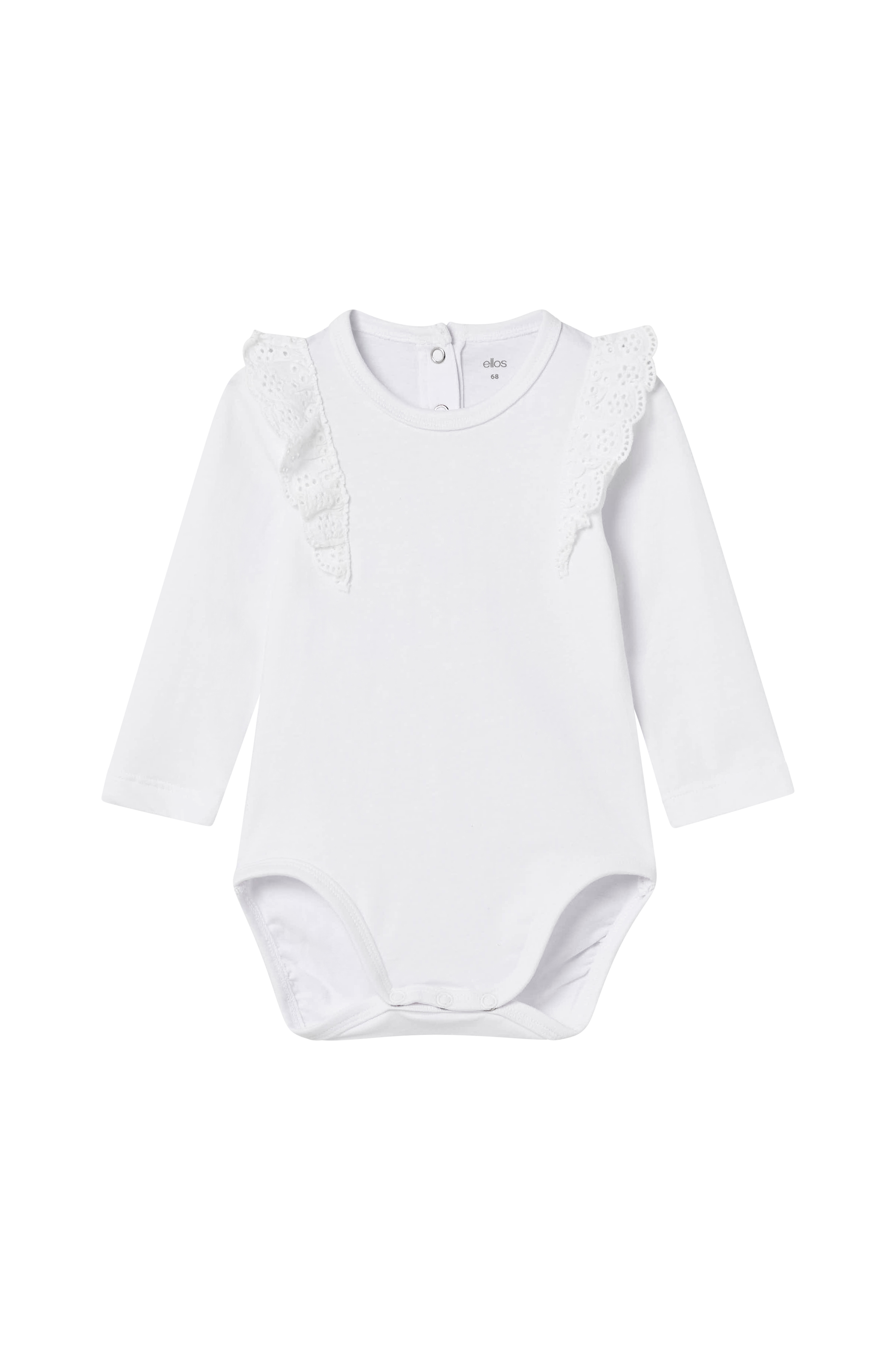 • Fremstillet af blød, elastisk bomuldsjersey• Volanter med hulbroderi omkring skuldrene• Rund halsudskæring med to trykknapper bagpå• Trykknapper ved skridtet