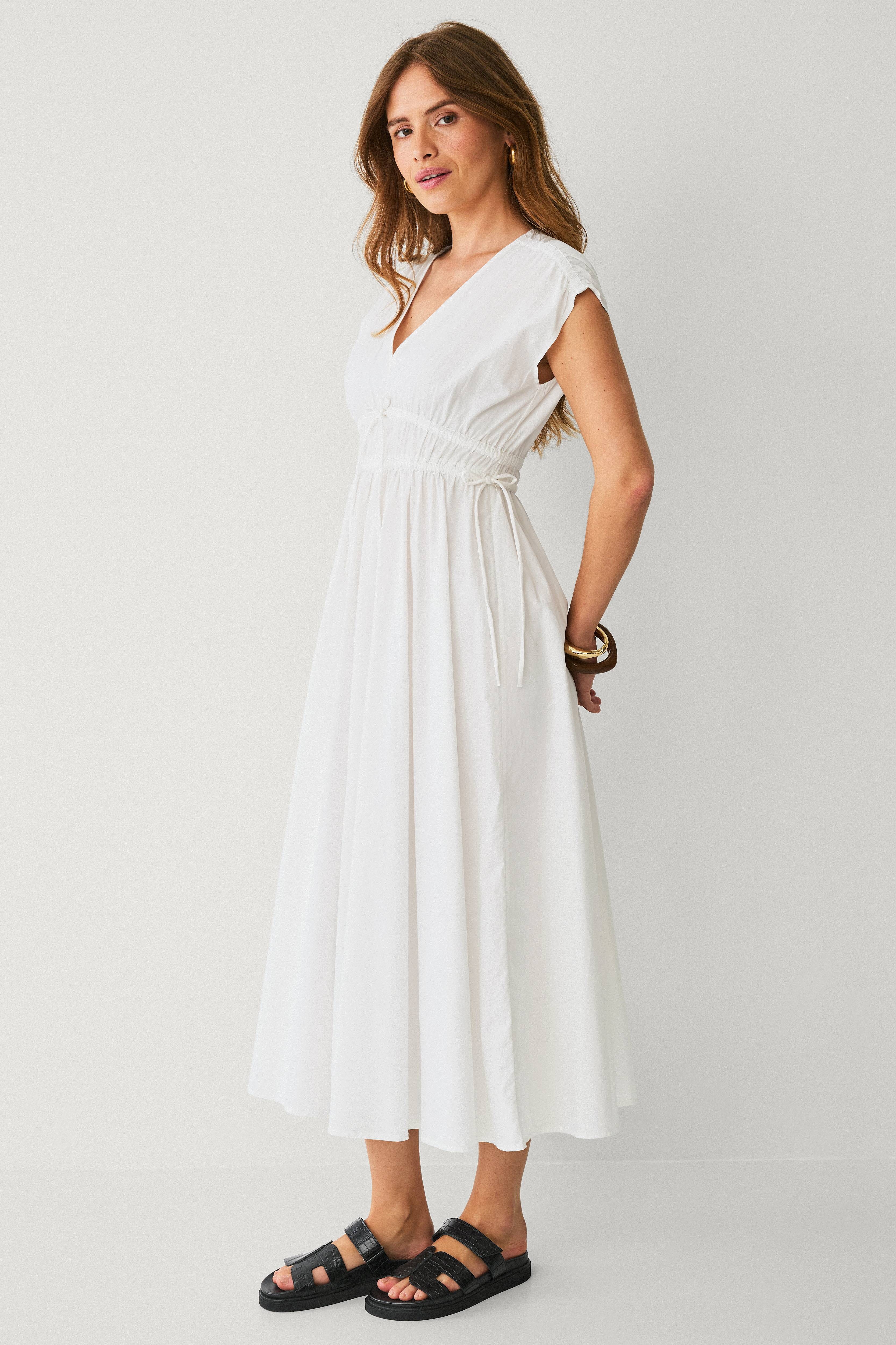 • Ærmeløs maxi kjole• Nedsænket skulder med indlagt elastik på oversiden• V-formet halsudskæring• Elastisk talje med træksnørre og bindebånd foran og i siderne• Længde: 130 cm i størrelse 38