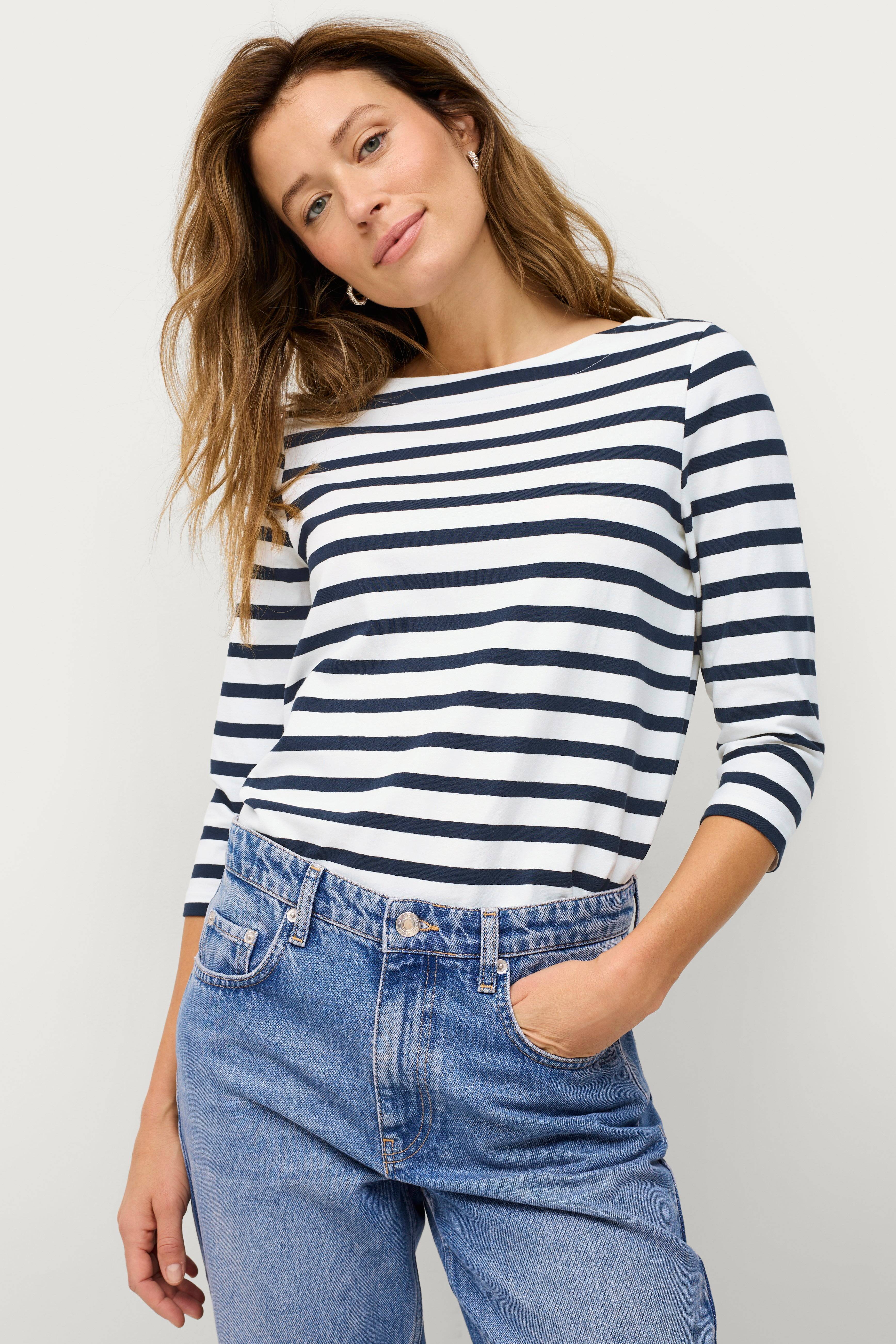• Top i bomuld• Bred, rund Bådhals• 3/4 lange ærmer• Længde: 62 cm i størrelse S