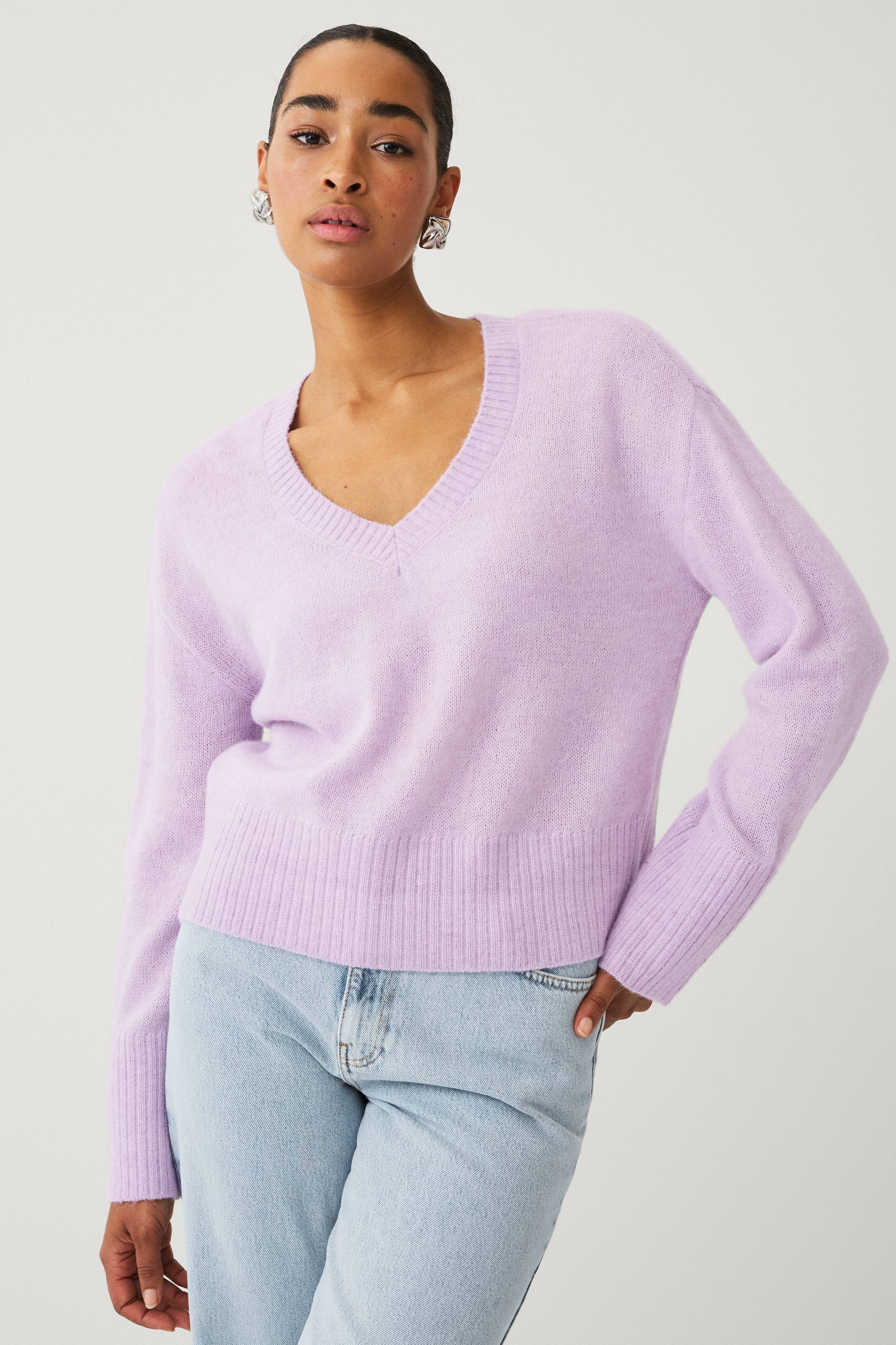Flot trøje, fin lilla farve, men kan ikke lide så brede ærmeafslutninger