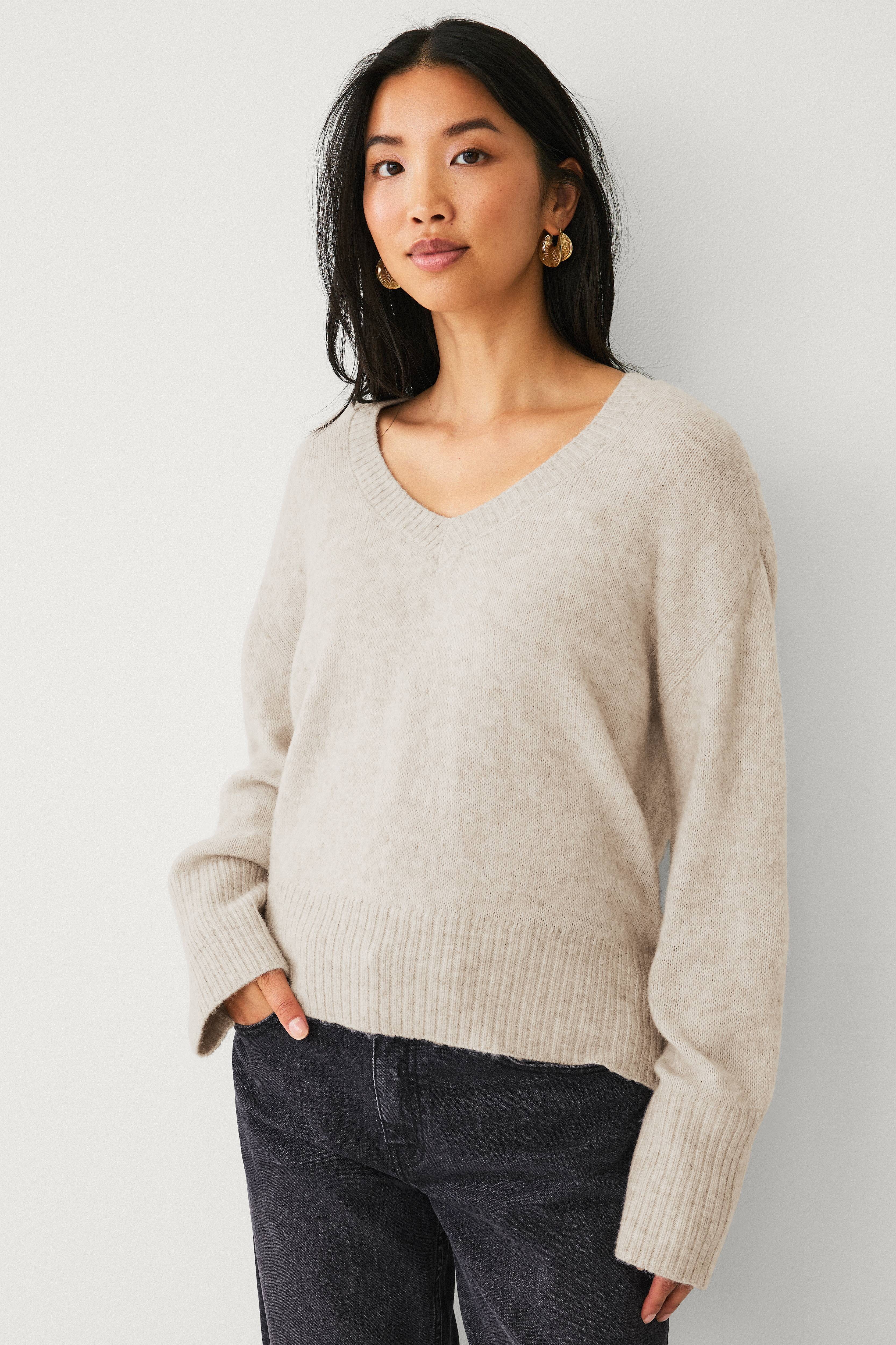 • Glatstrikket, lige model• Dyb v-udskæring med ribkant• Nedsænket skulder med langt, lige ærme• Bred ribstrik nederst og ved manchetterne• Længde: 57 cm i størrelse S