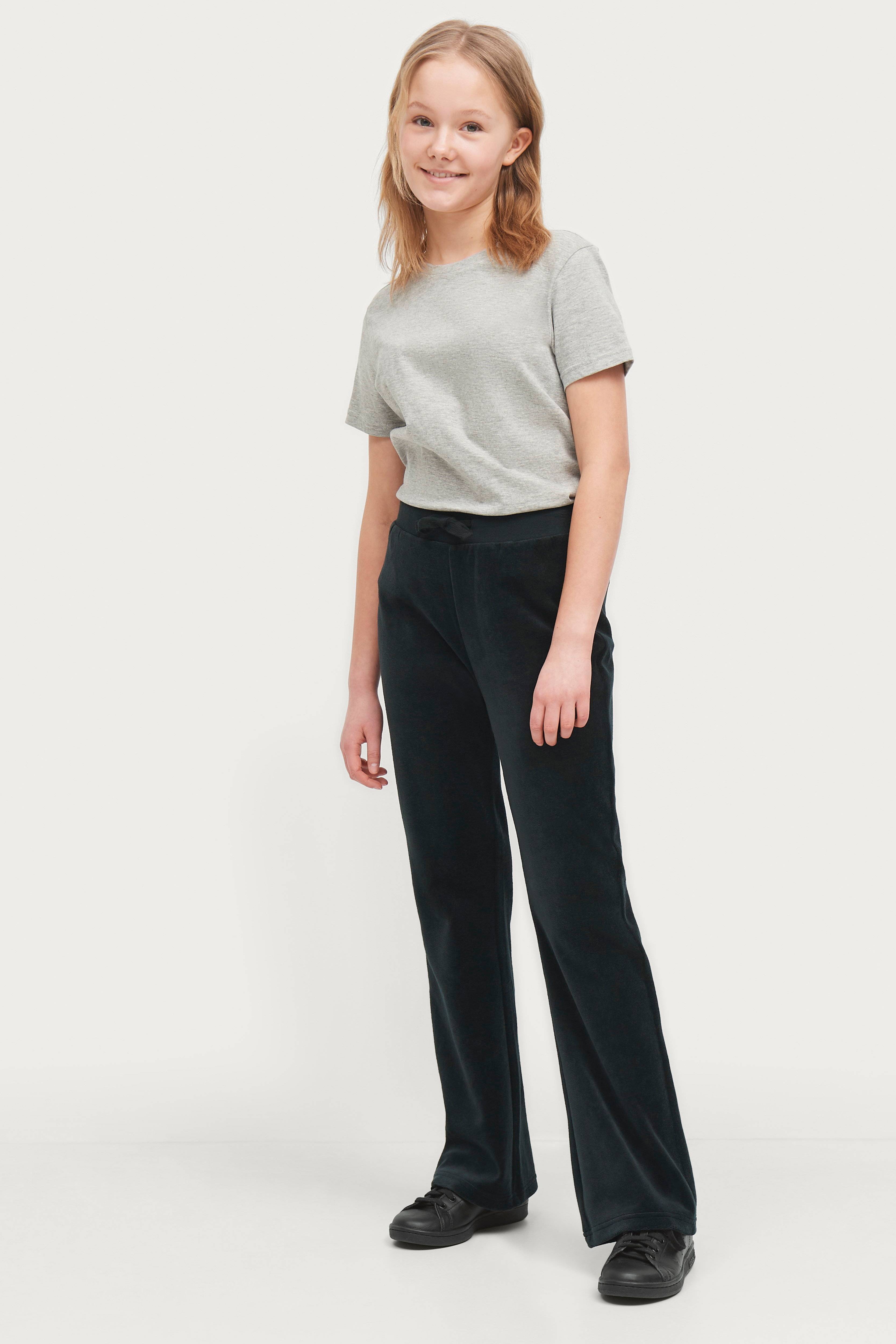 Bukser i blød velour med A-formede ben. Elastisk linning i rib med løbegang.