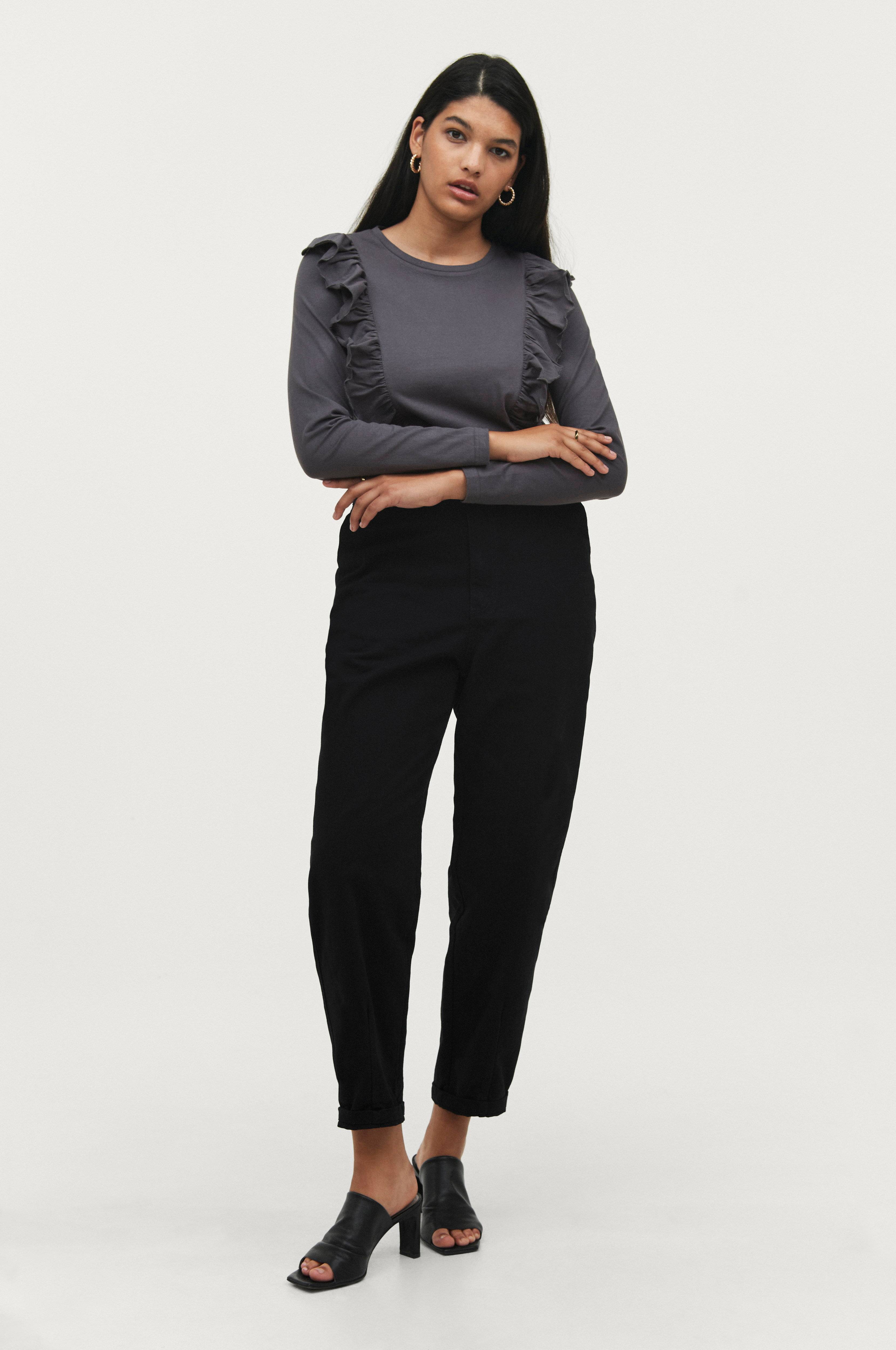 Løse twillbukser med høj talje, vide lår og smallere pasform forneden. Ombukket benkant, ikke fastsyet. Lommer foran og snydelommer bagpå. Lynlåsgylp. Indvendig benlængde ca. 70 cm med opslag i benkant.