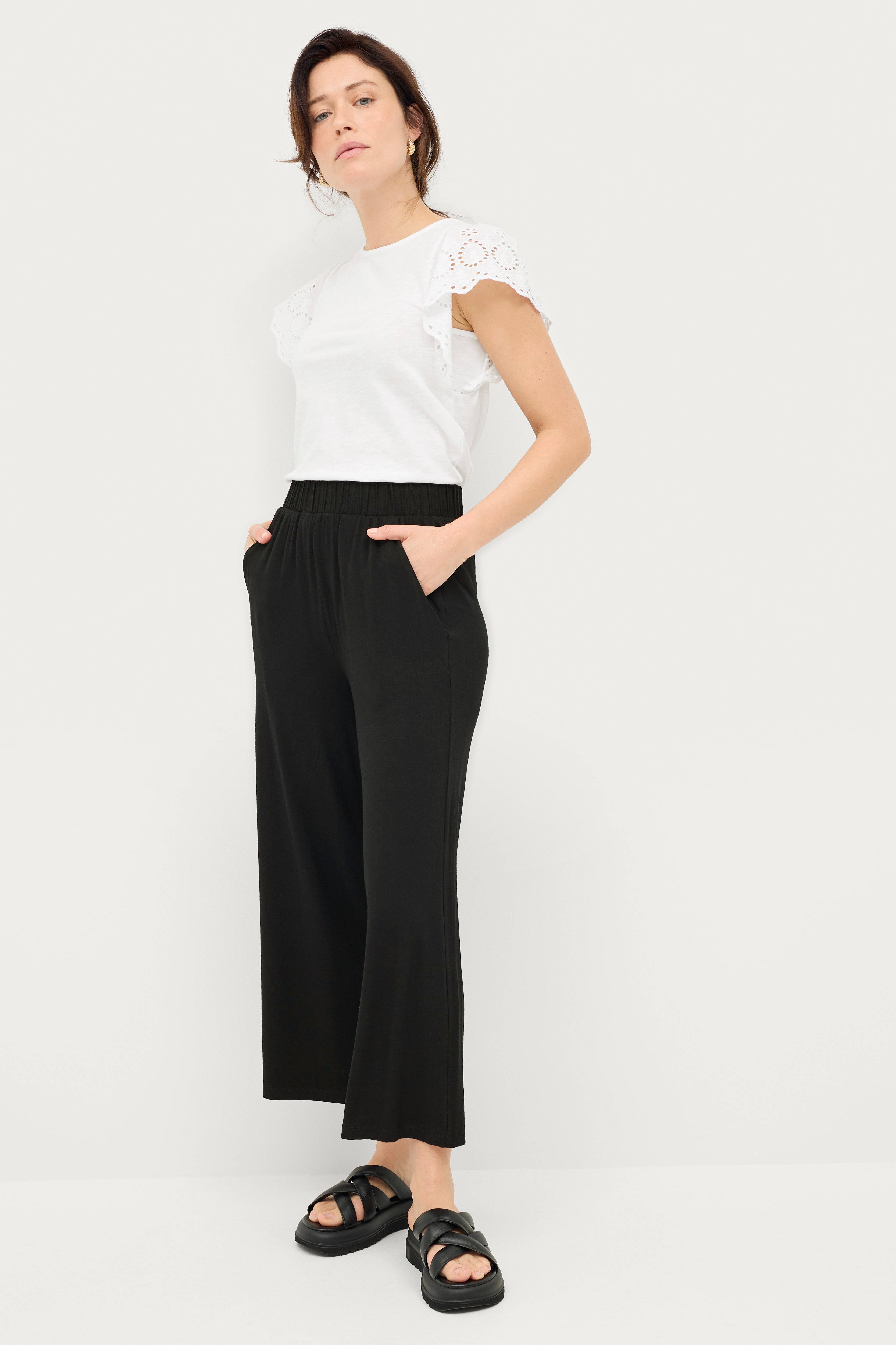Behagelig, blød jersey. Bukserne med pænt fald. Normal i størrelsen. Har købt både bukser og bluse.
