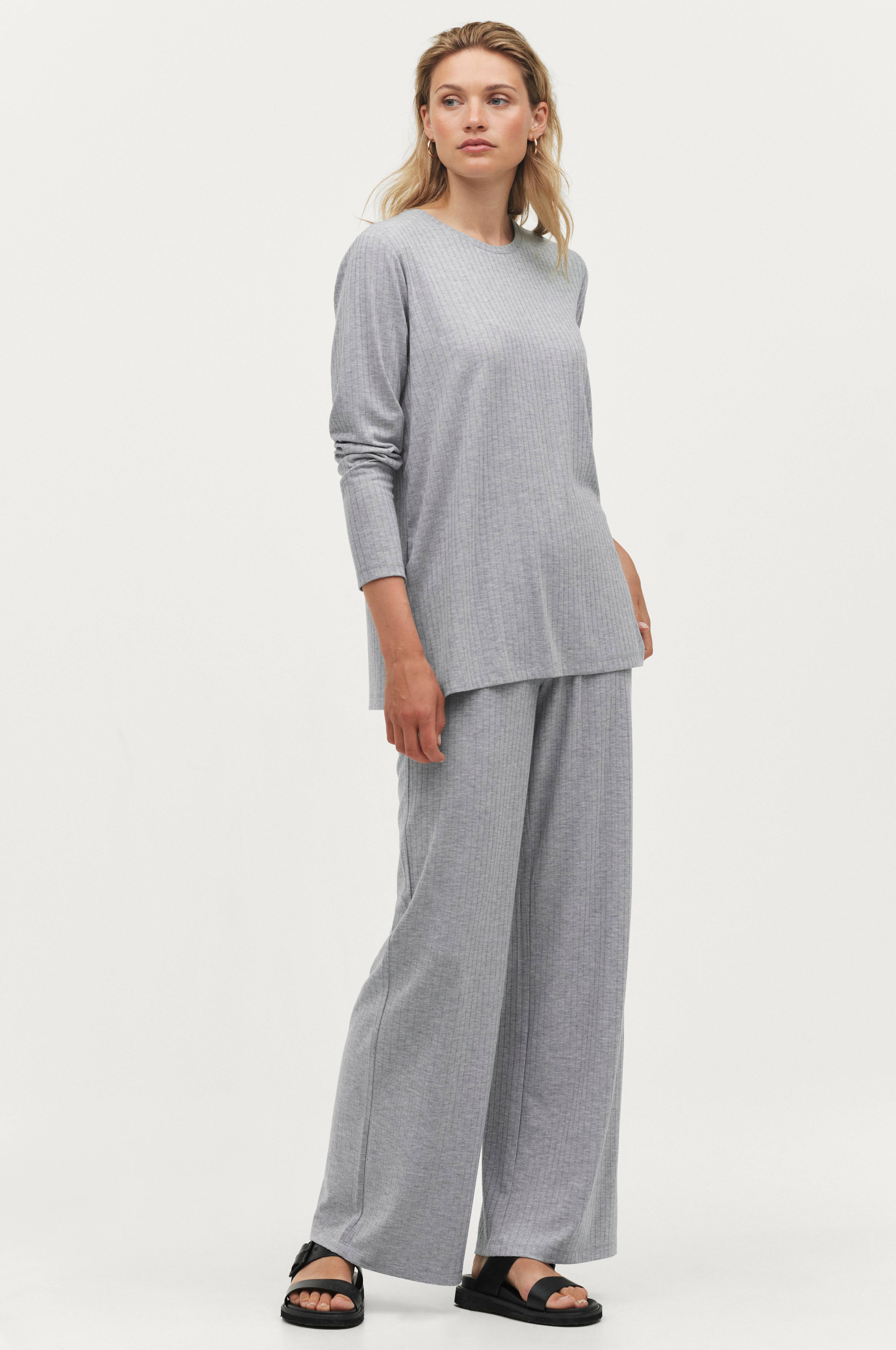Riflede jerseybukser i blød kvalitet. Lige, vide ben. Indvendig benlængde ca. 75 cm i str. 34/36.