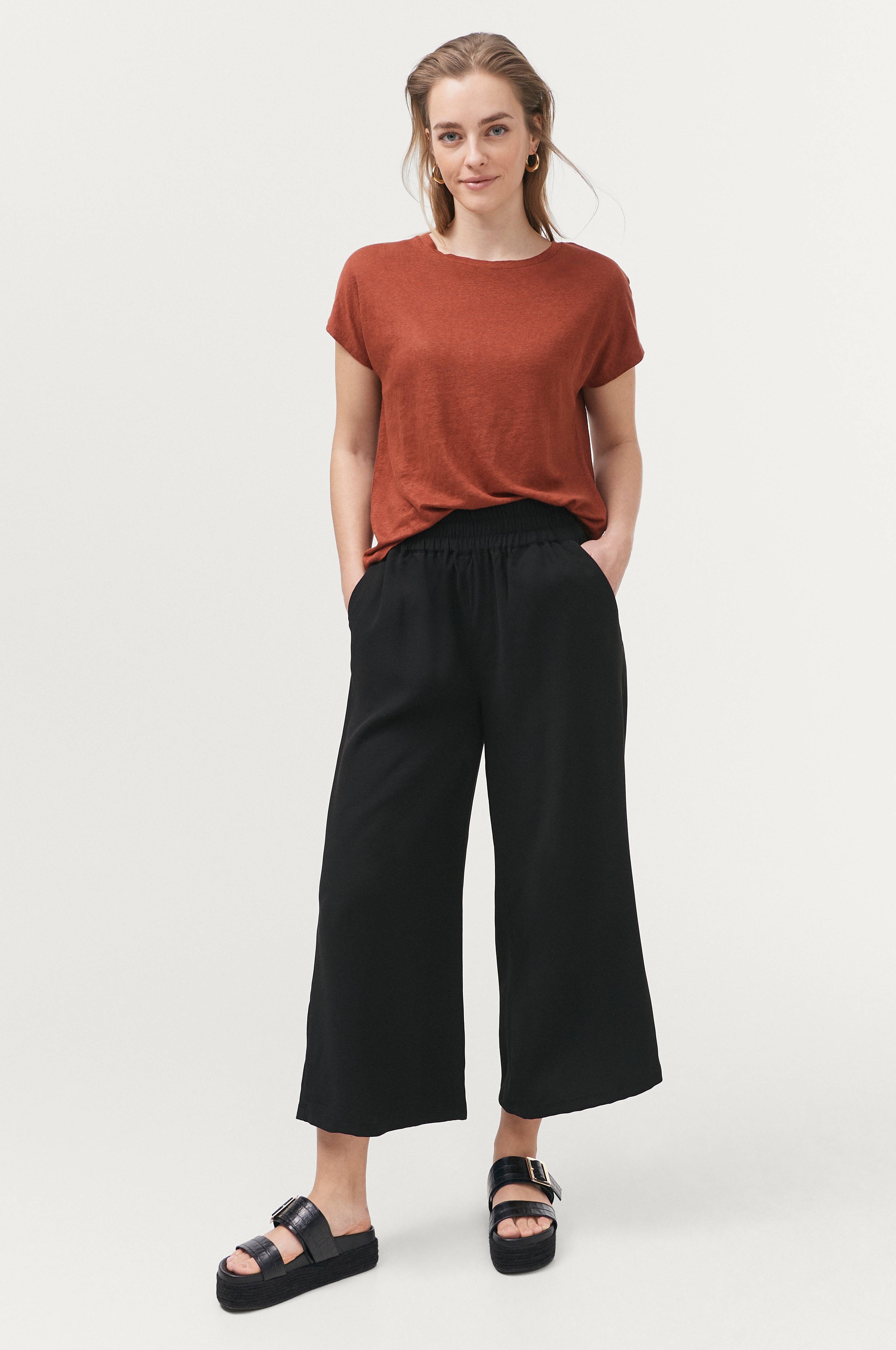 Vide bukser med høj talje og ankellange ben. Bred elastik i taljen og lommer i siden. I vævet kvalitet.