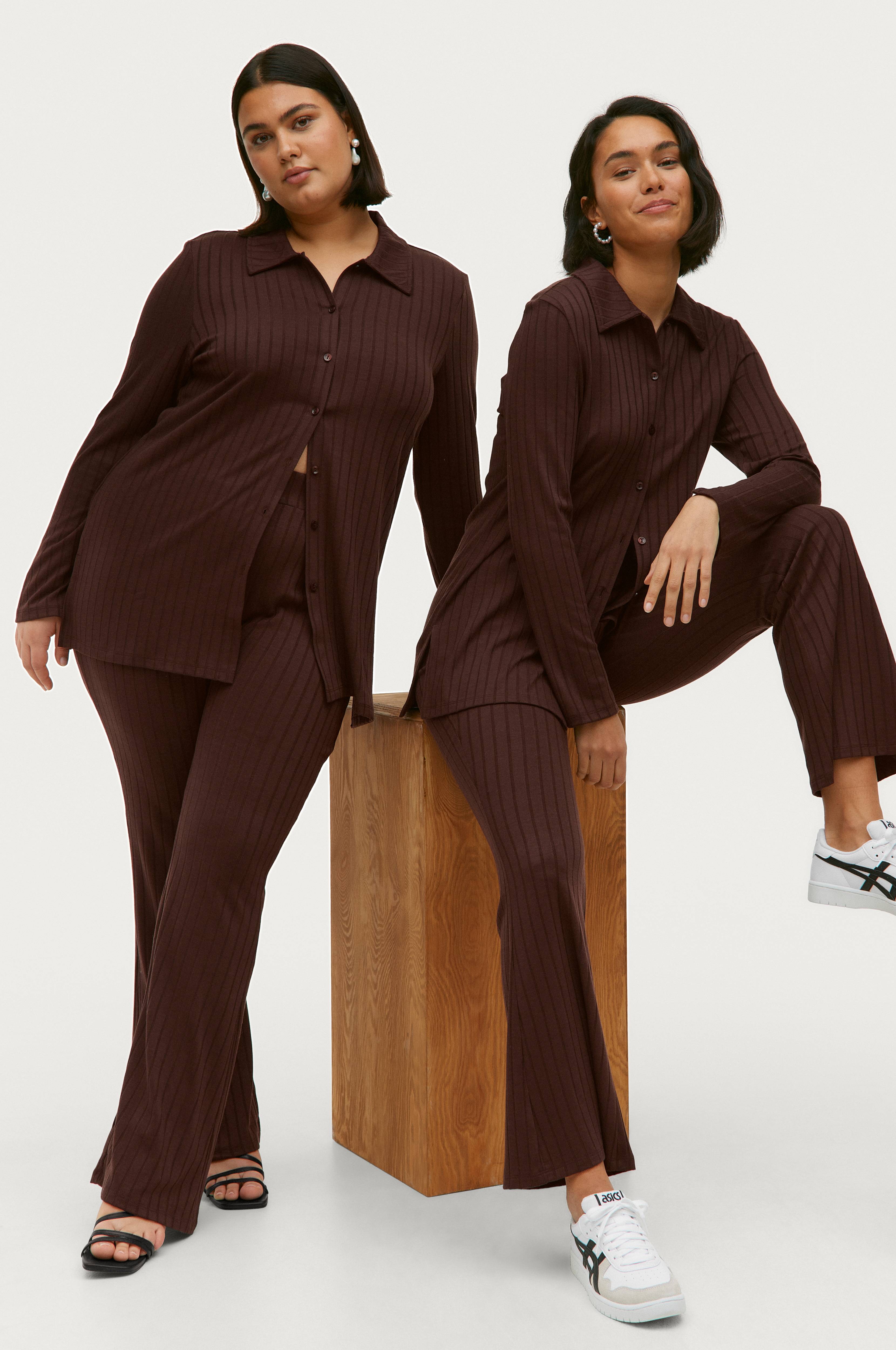 - Elastisk talje- Blødt stretchmateriale i rib- A-formet benkant