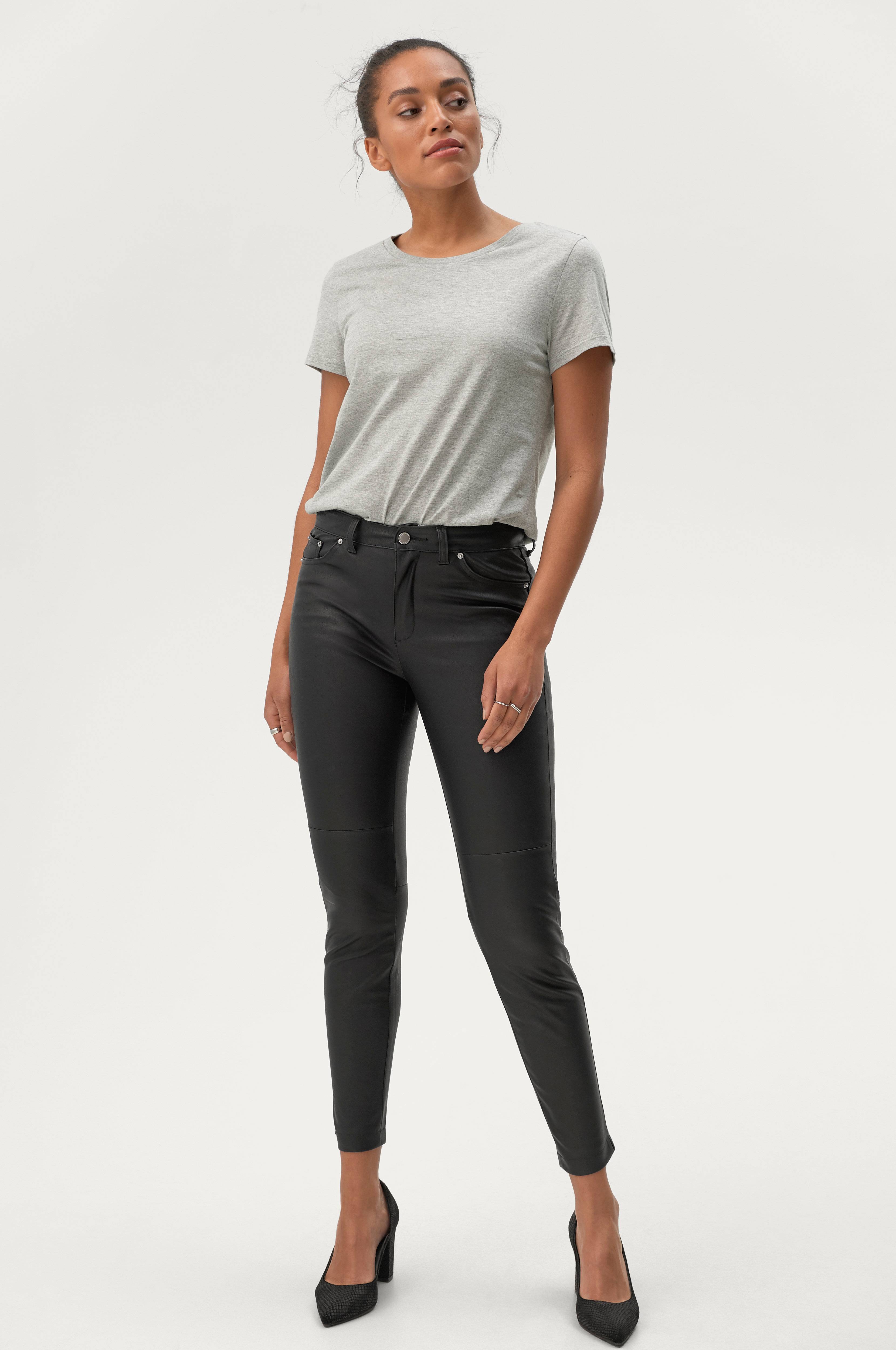 Bukser Sasha PU i smal model med smalle ben og lille slids i benkant samt fem lommer og lynlåsgylp. I imiteret læder med blød inderside.