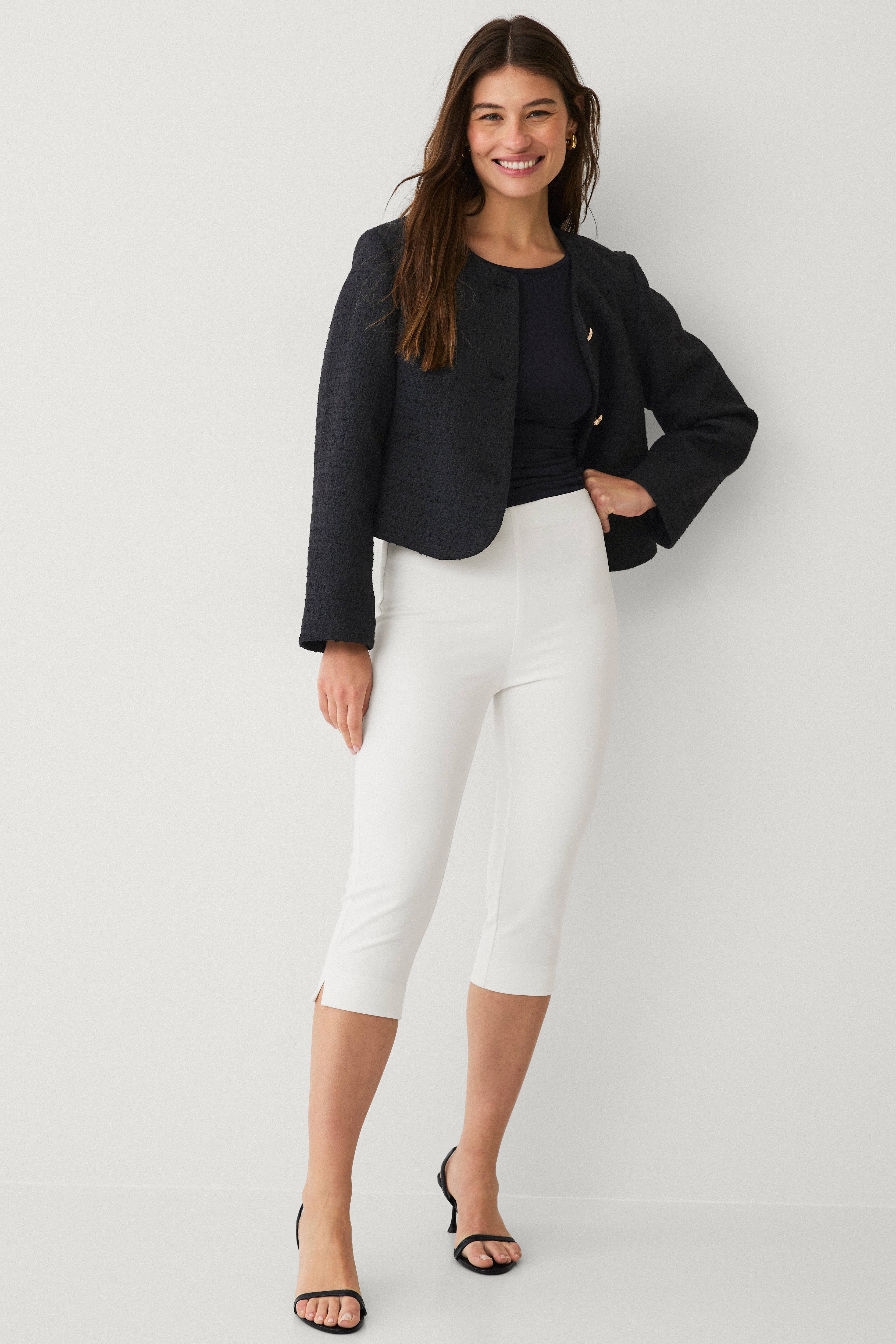 • Treggings i elastisk materiale med caprilængde • Indsnit bagpå ved taljen • Lukning med lynlås og knap i siden • Kort slids nede i siderne • Elastisk bånd ved taljen • Indre benlængde: 48 cm i størrelse 36