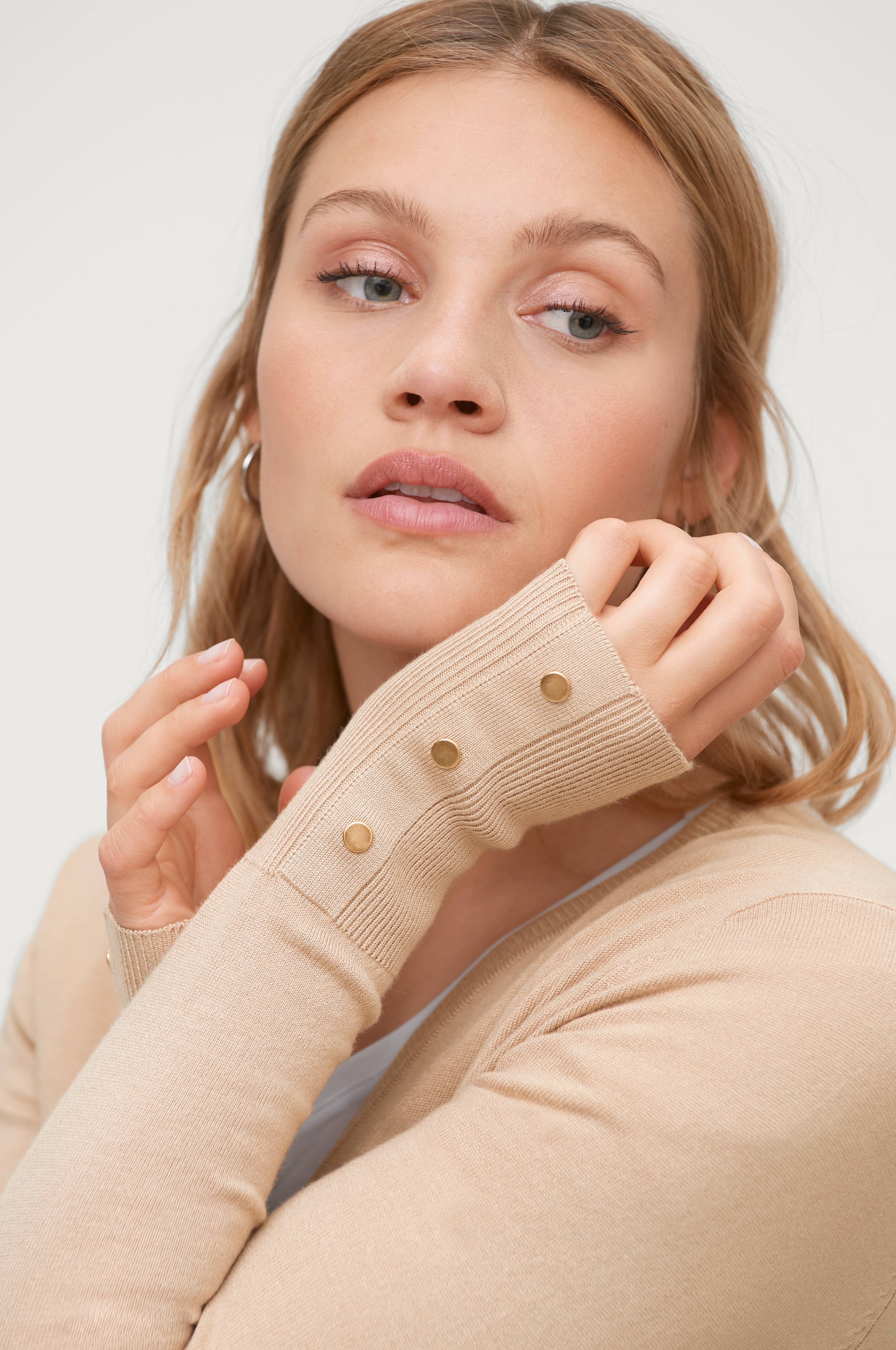Cardigan Celia, klassisk model i blød, finstrikket kvalitet med V-udskæring og guldfarvede knapper foran. Brede, ribstrikkede ærmekanter med dekorative guldknapper. Længde ca. 62 cm i str. 34/36.
