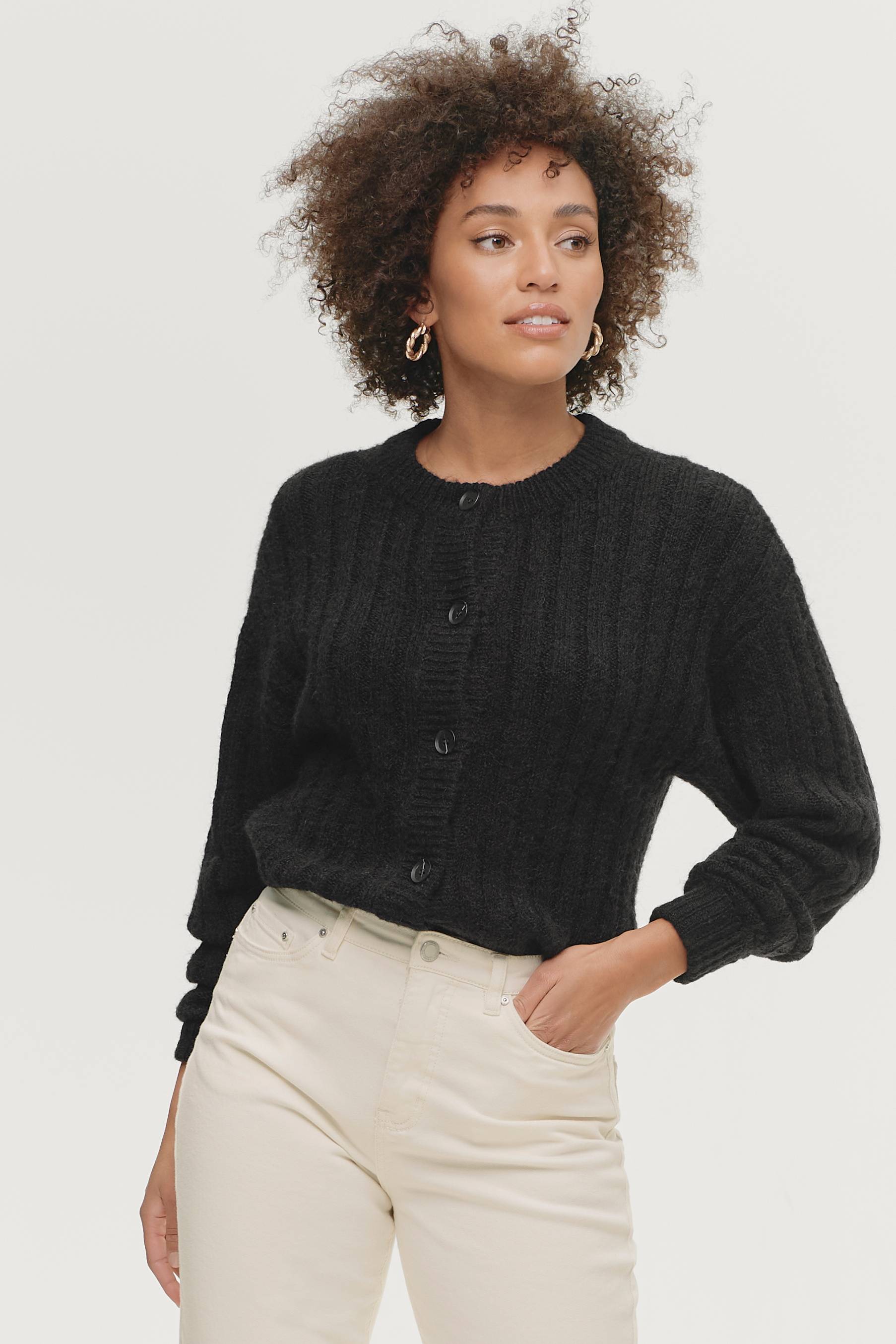 Cardigan Felicia med strikkede strukturstriber over det hele. Rund hals og lukning hele vejen foran samt ekstra langt ærme. Længde ca. 57 cm i str. 34/36.