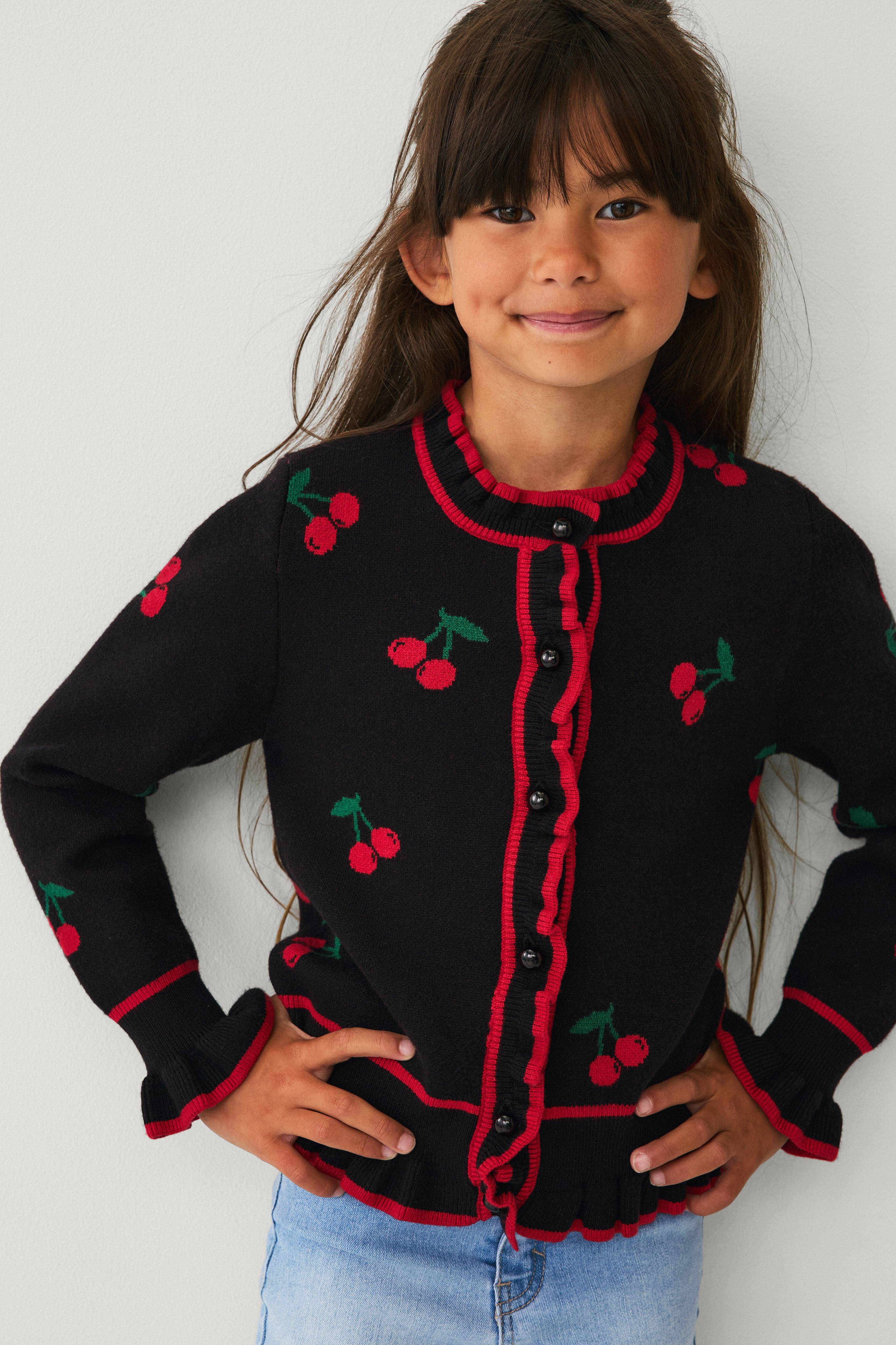 • Fintstrikket cardigan med Kirsebær-mønster• Rund halsudskæring• Blanke, afrundede knapper foran• Flæsekant rundt om halsudskæringen, på knaplukningen, ved ærmeafslutningerne og nederst