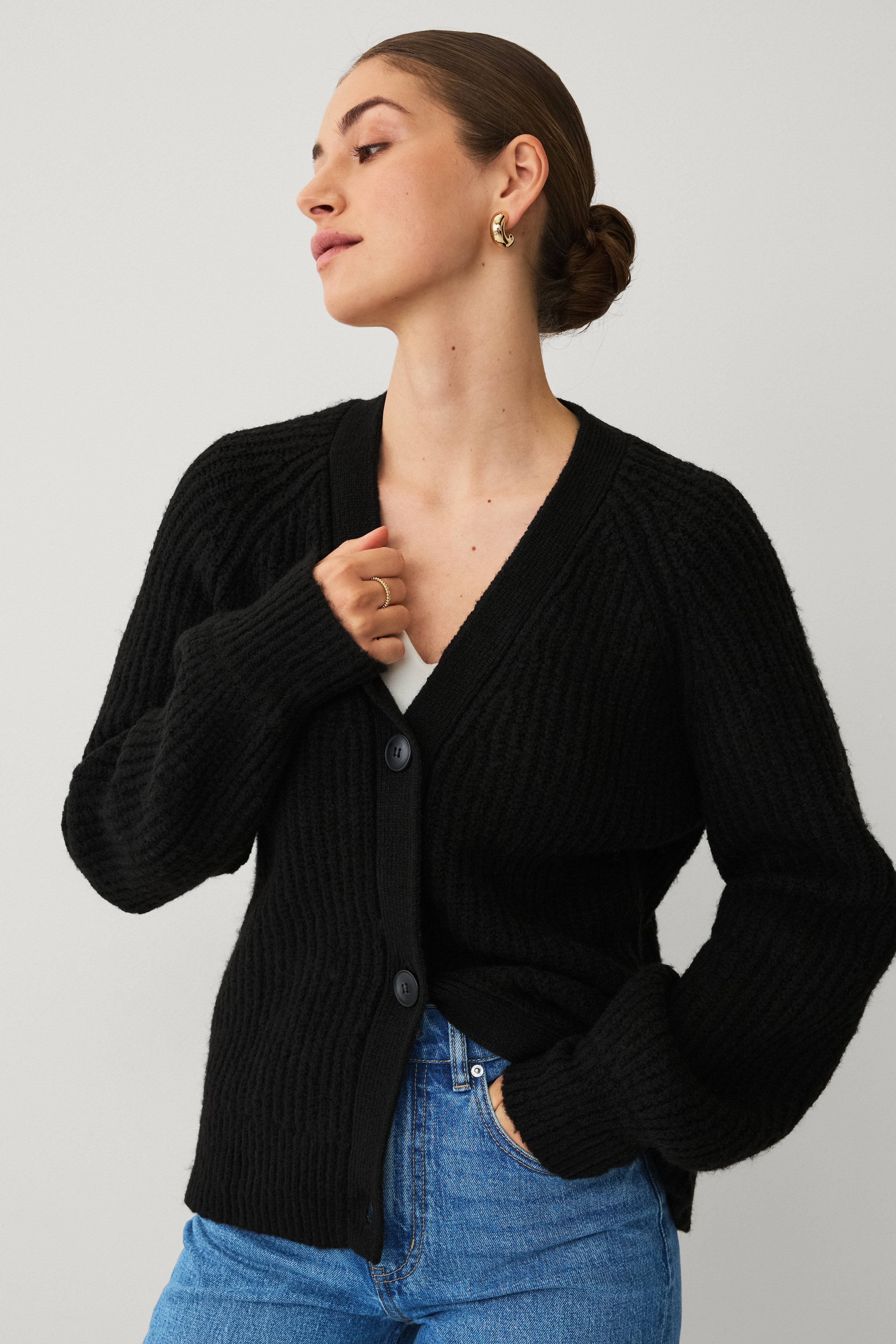 • Blød, strikket cardigan• V-formet halsudskæring• Knapper foran• Ribmanchetter ved manchetterne og ved nederste kant• Længde: 62 cm i størrelse S