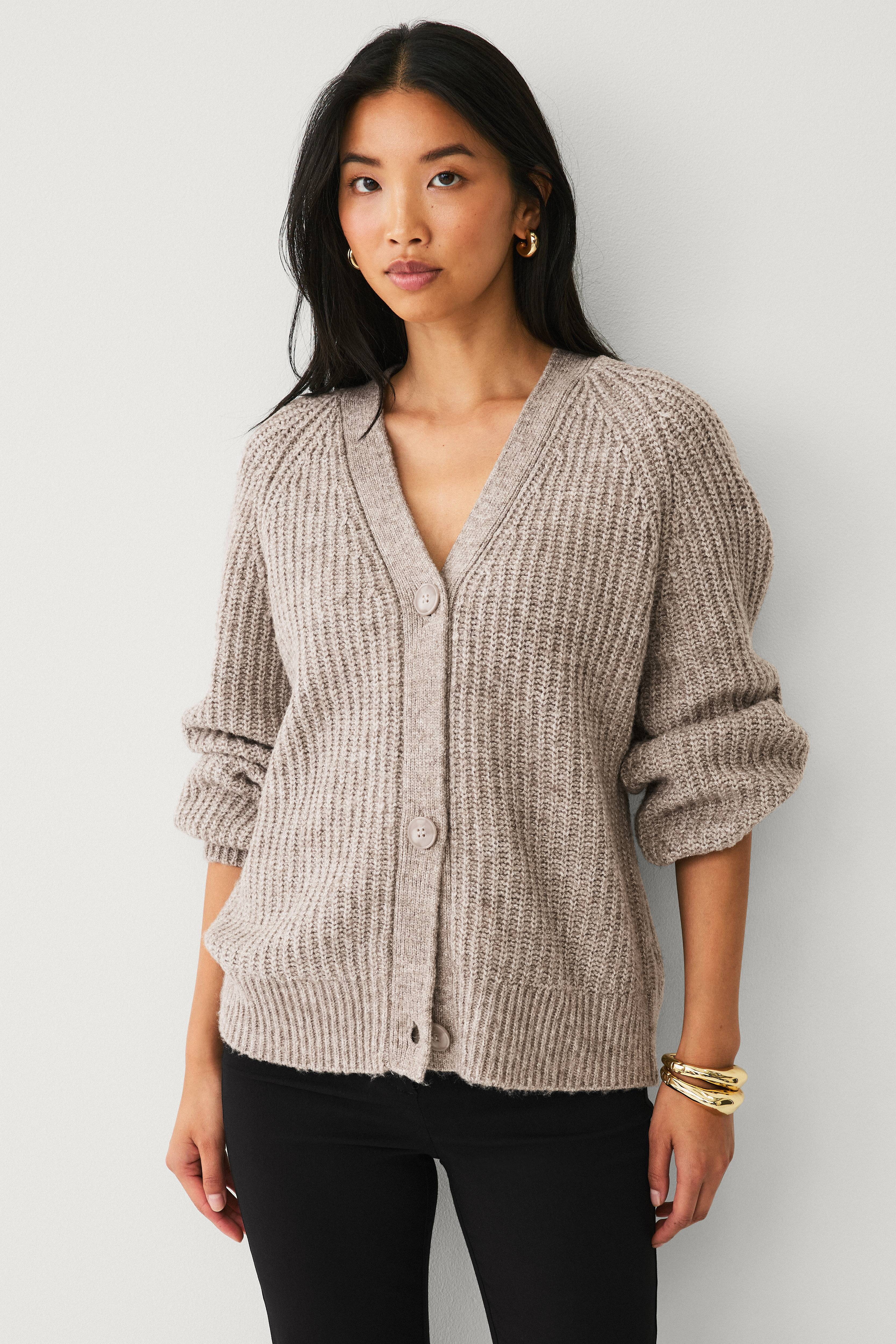 Behagelig cardigan. Lidt tykkere end forventet, men vil være dejlig til efterår og vinter. Flot gråbrun farve.