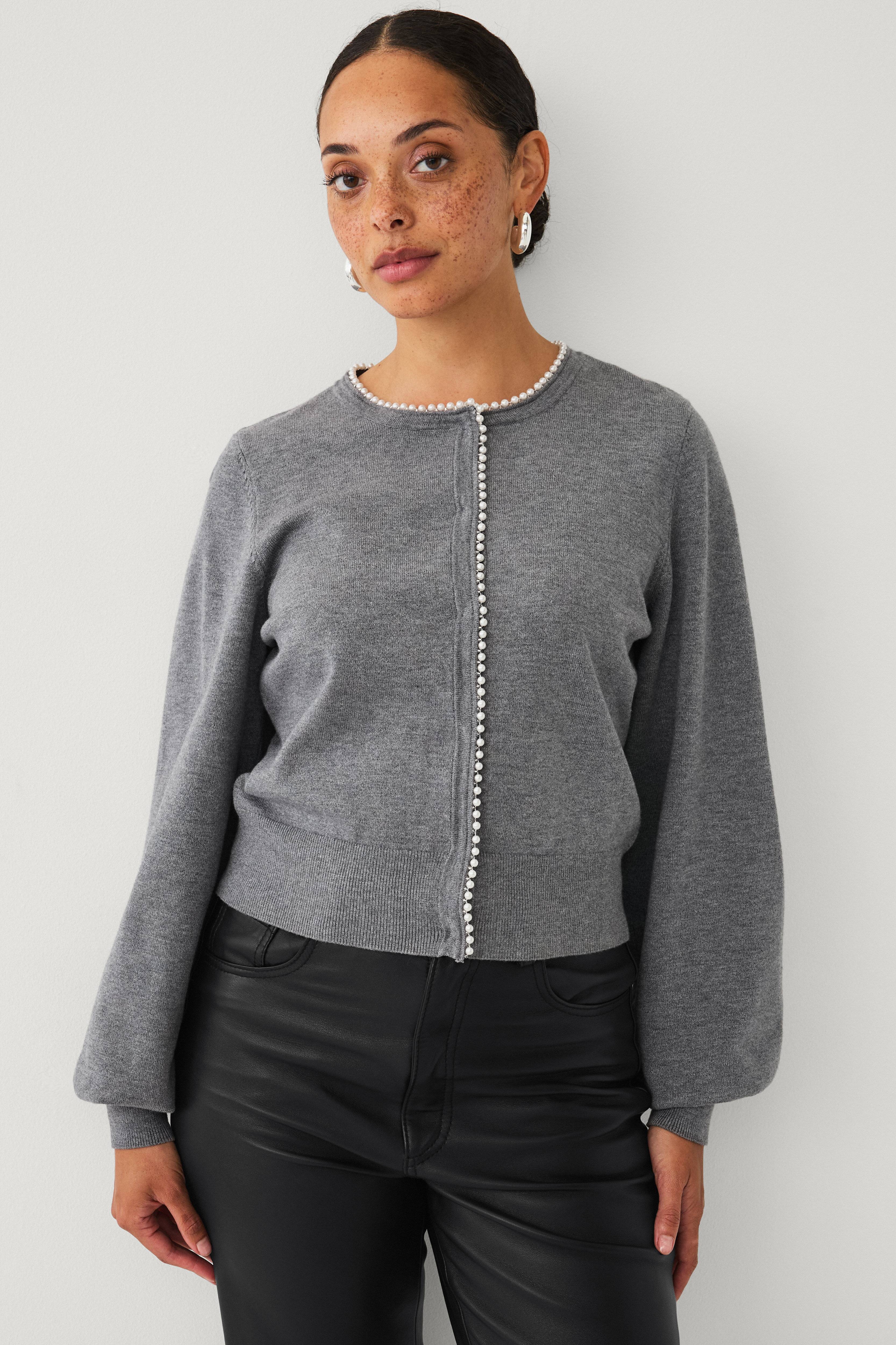 • Fintstrikket cardigan med knaplukning • Rund halsudskæring • Lange ærmer • Manchet ved manchetterne • Kant i perle langs udskæringen og langs knappen foran • Normal pasform • Længde: 54 cm i størrelse S