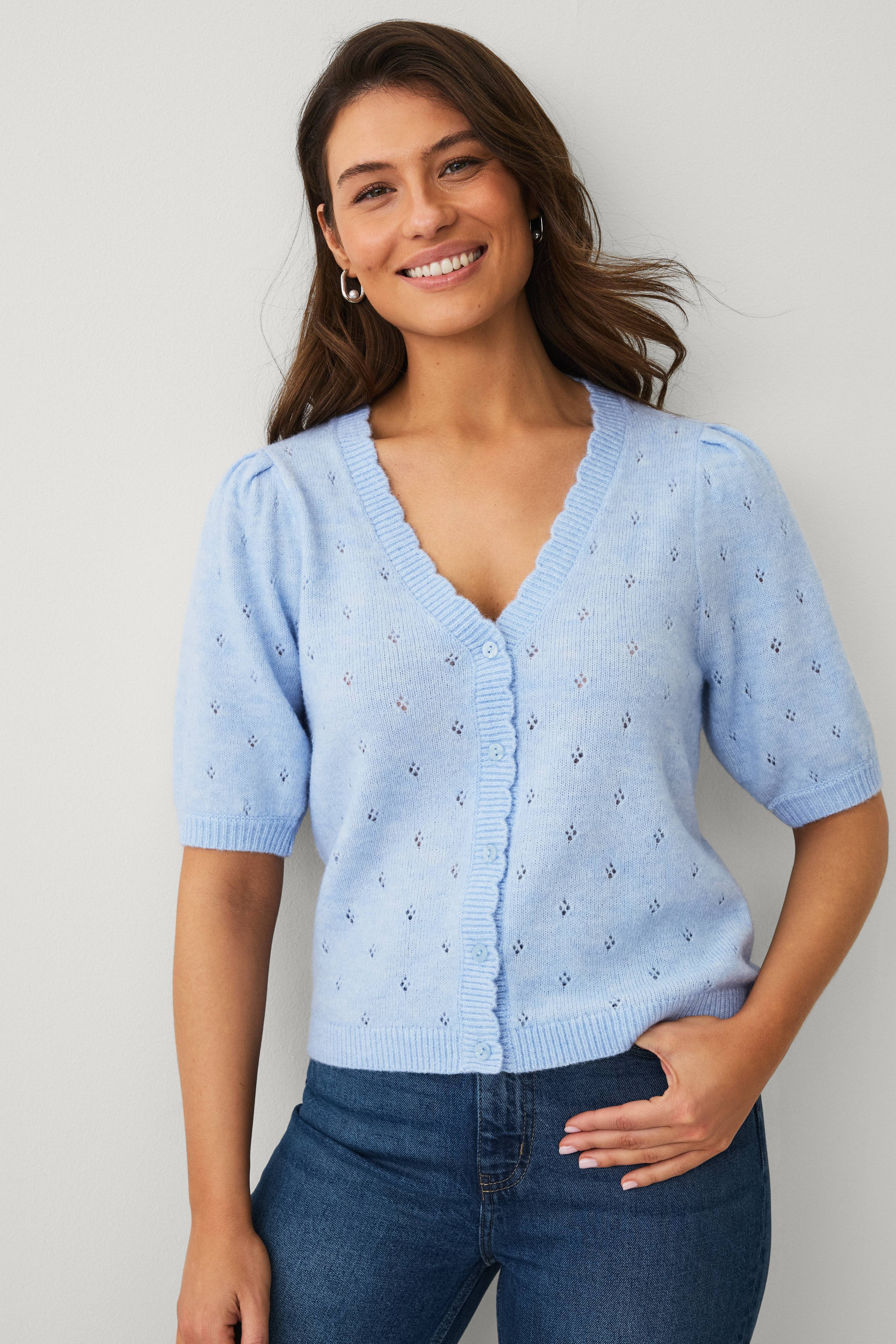 • Hulmønstret cardigan• V-udskæring• Korte pufærmer• Knaplukning• Ribstrikkede detaljer• Normal pasform• Længde: 55 cm i størrelse S