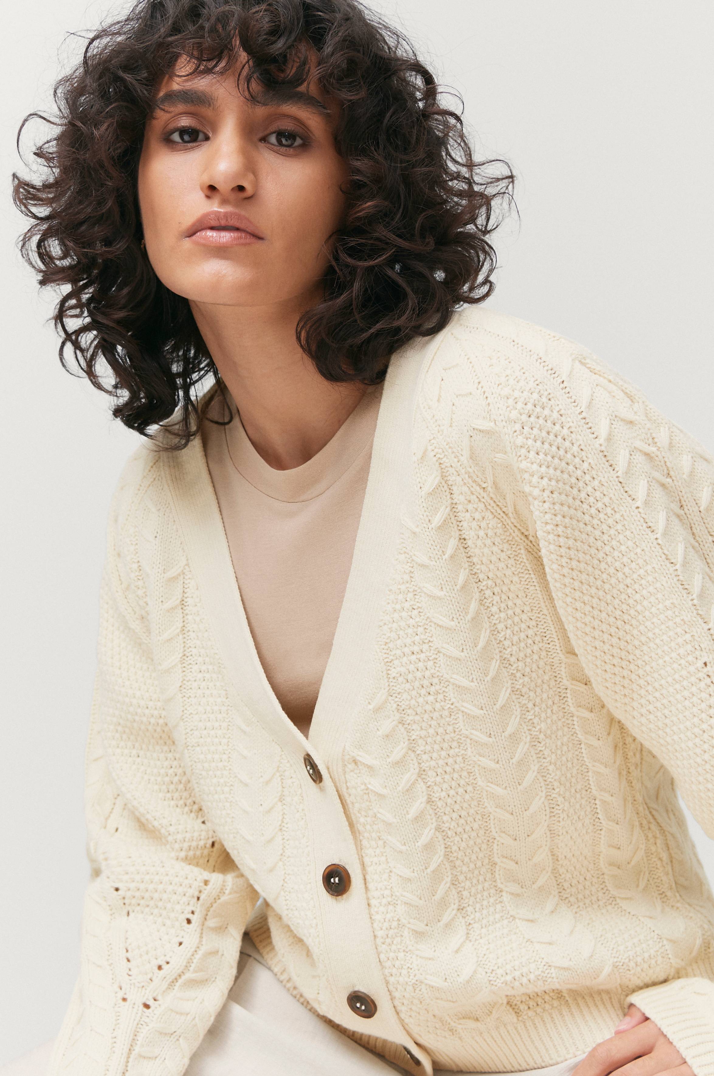 Cardigan Pallas med kabelstrikket mønster. V-udskæring og knapper foran. Længde ca. 58 cm i str. 34/36.