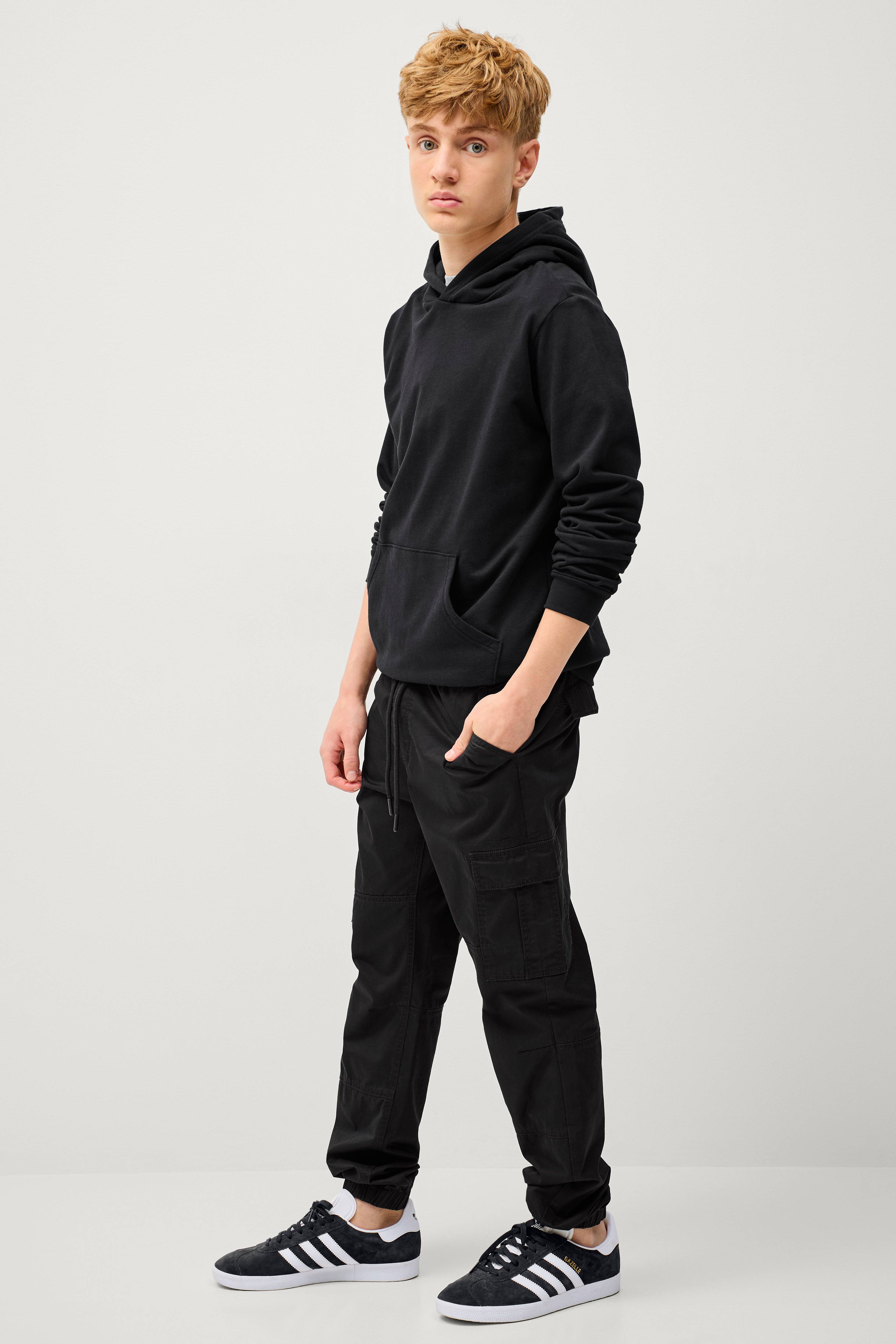 • Cargobukser i bomuld• Elastisk talje med træksnørre• Sidelommer• To baglommer med lommelåg• To benlommer med lommelåg og trykknap• Elastik ved enden af benene