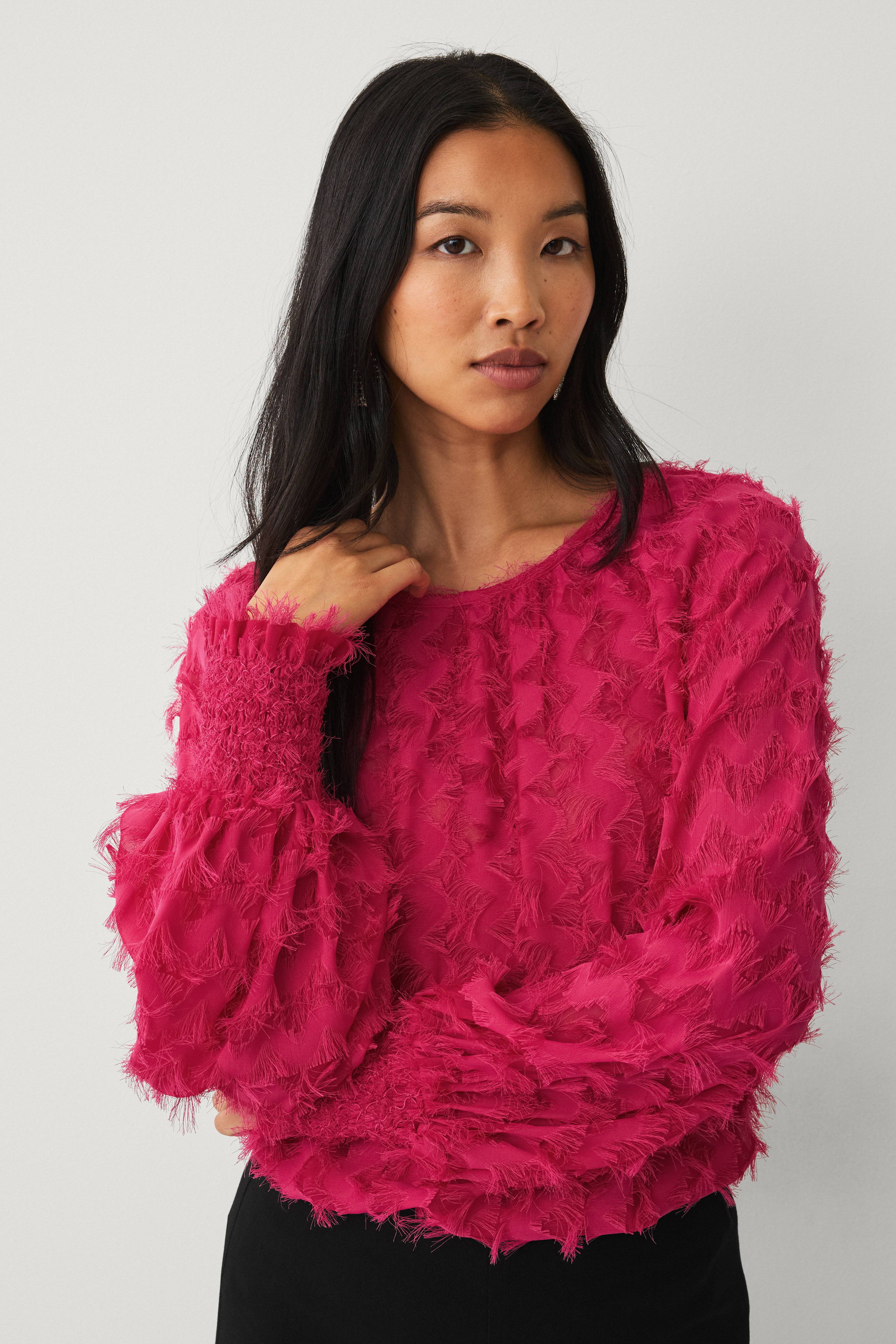 • Store størrelser• Lige, uformel model med små, tynde frynser overalt• Rund hals med knap i nakken• Langt raglanærme med bred, elastisk smock ved manchetterne• Længde: 64 cm i størrelse S