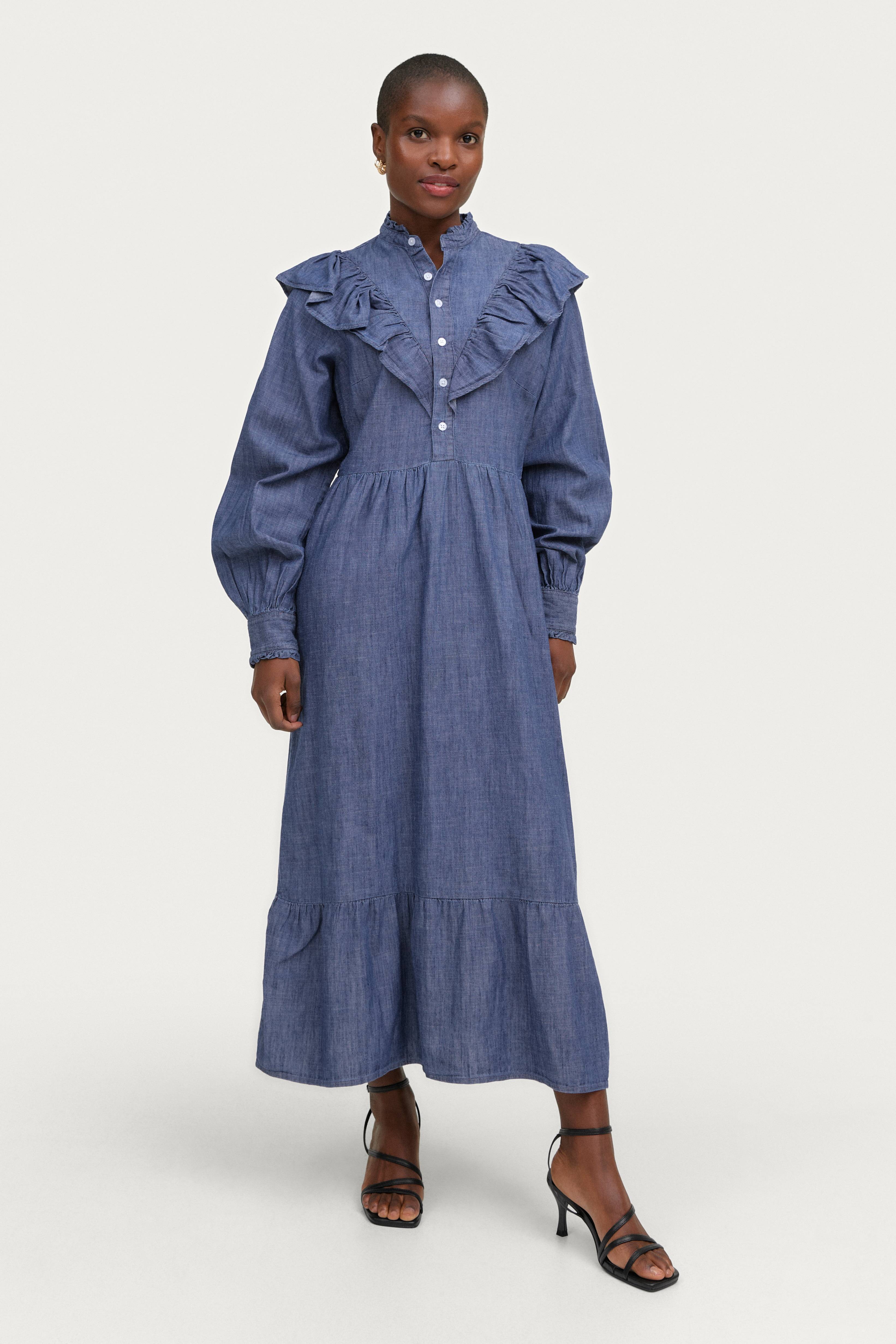 • Kjole i bomuldsdenim • Knapper foran • Rund hals • To knapper ved manchetterne • Volantdetaljer omkring skuldrene, foran og bagpå • Længde: 125 cm i størrelse 36 • Ellos samarbejder med Better Cotton for at forbedre bomuldsdyrkningen globalt. Better Cotton er en global nonprofitorganisation, der underviser bomuldsdyrkere i metoder til mere bæredygtig bomuldsdyrkning og arbejder for mere effektiv brug af vand og reduceret brug af pesticider. Better Cotton bringer forbedrede sociale, økonomiske og miljømæssige forhold for bomuldsbønder. Ved at vælge vores bomuldsprodukter støtter du vores investering i Better Cottons mission. Better Cotton er fremskaffet via et system med massebalance og kan ikke fysisk spores til slutprodukter. Besøg bettercotton.org/learnmore for mere information om Better Cotton.
