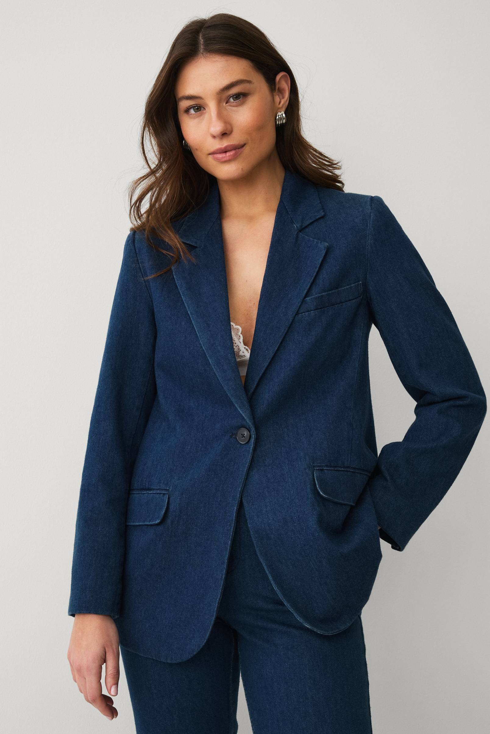 • Habitjakke i tynd denim• Lige pasform• Let forede skuldre• Lukning med en knap• To lommer med lommelåg• Fire dekorationsknapper ved manchetterne• Vævet for• Længde: 72 cm i størrelse 36