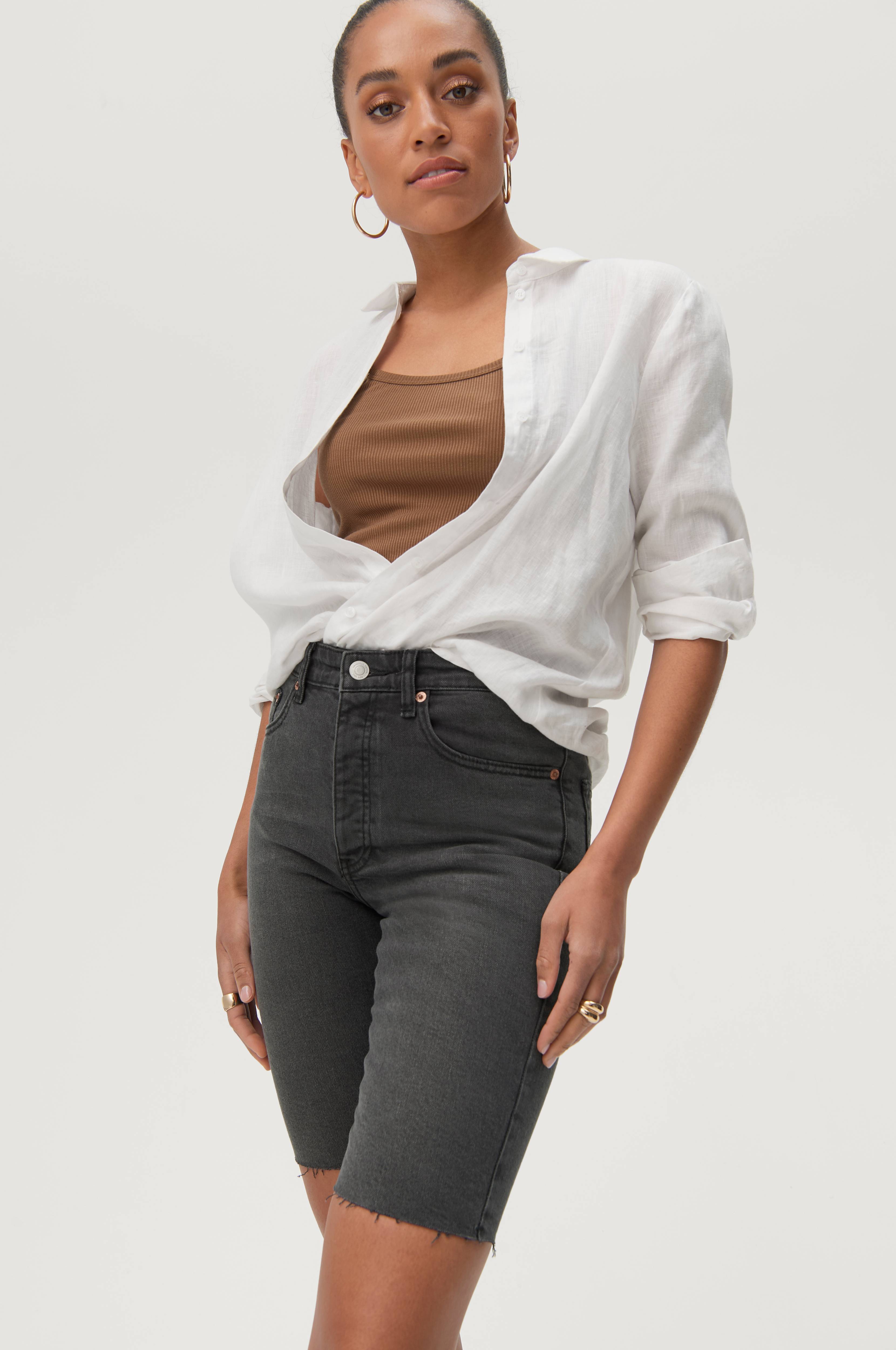 Denimshorts Lucy Vintage i afklippet, lidt længere model i stretchdenim. 5-lommemodel med knapgylp. Slidt kant langs lommeåbningen. Indvendig benlængde ca. 26 cm i str. 36.
