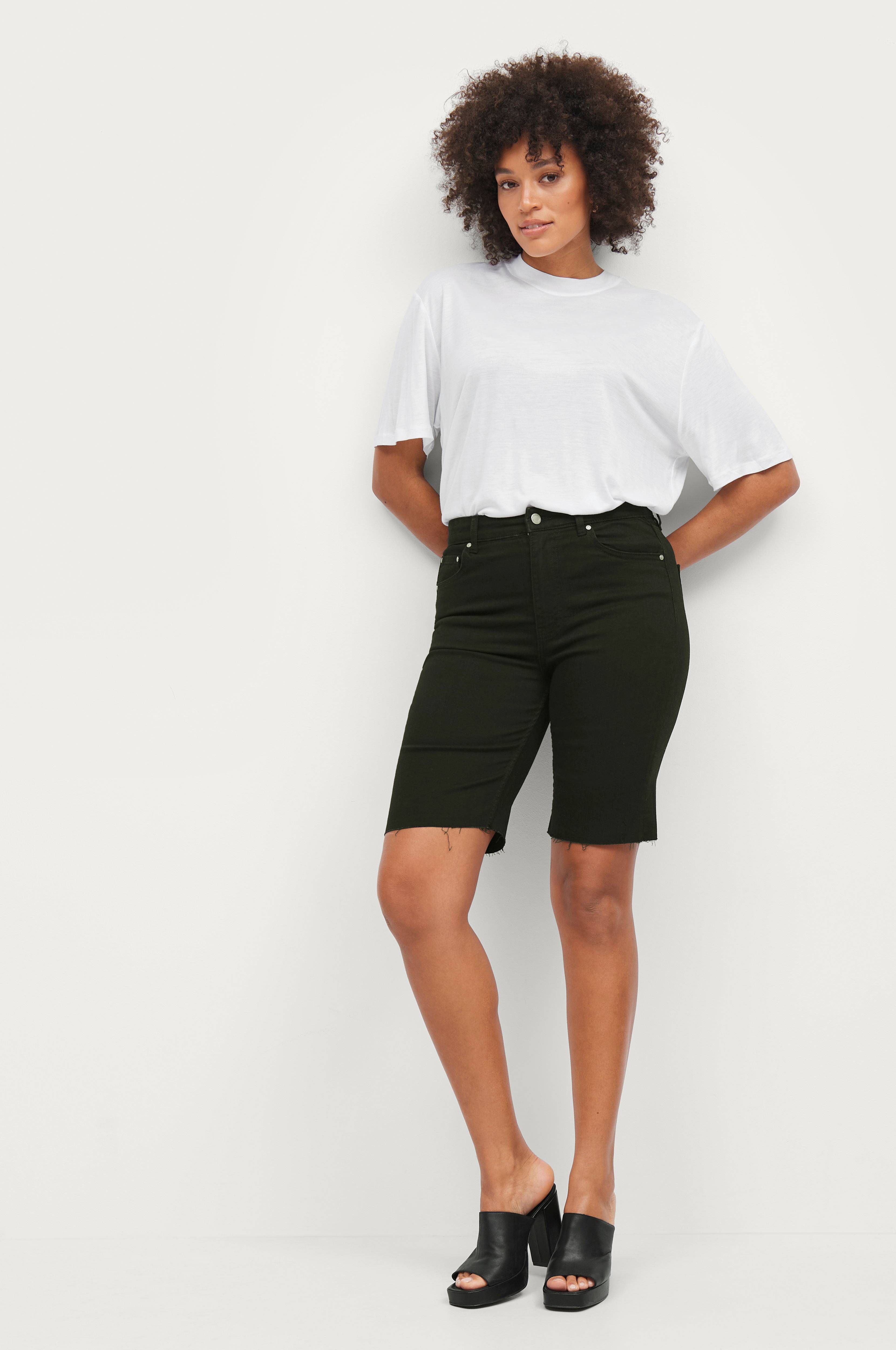 Denimshorts med høj talje og rå benkant. 5-lommemodel med lynlås i gylpen. Syet i stretchkvalitet. Indvendig benlængde ca. 26 cm i str. 36.