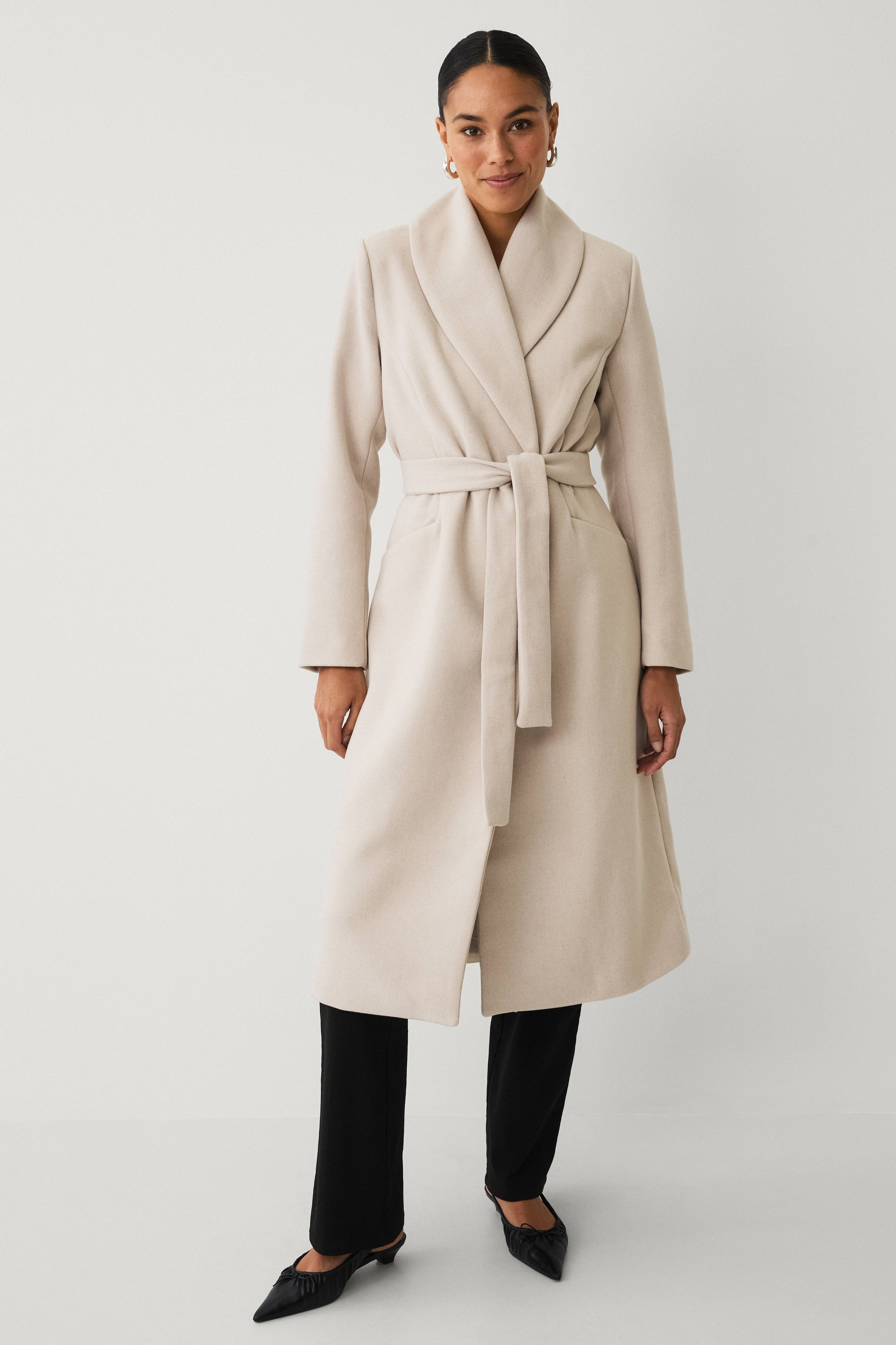 • Fremstillet af filtet uldmiks• Lukning med en skjult trykknap• To lommer• Aftageligt bæltespænde ved taljen• Vævet, glat for• Slids bagpå• Længde: 120 cm i størrelse 36