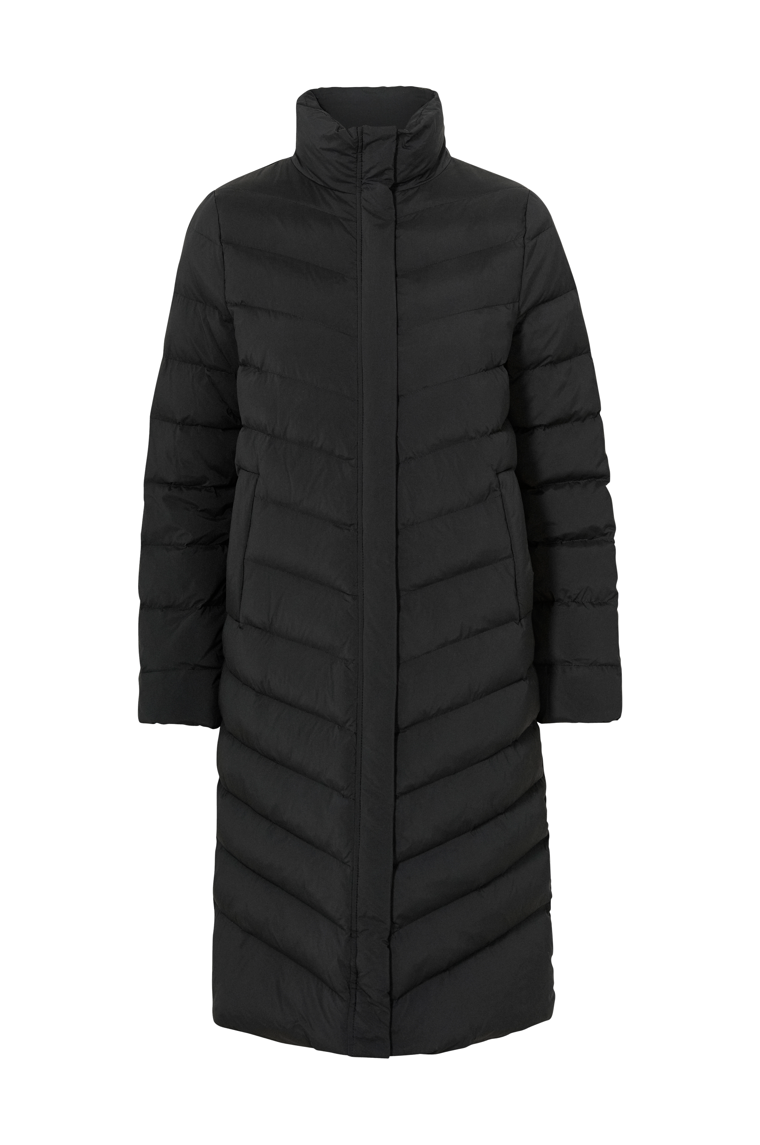 Let dunfrakke med blødt, let og varmt fyld. For i genindvundet polyester. To fleeceforede lommer. Lukning med 2-vejslynlås og overfald over lynlåsen med trykknapper. Elastik i ærmekanten. Længde ca. 104 cm i str. 34/36.