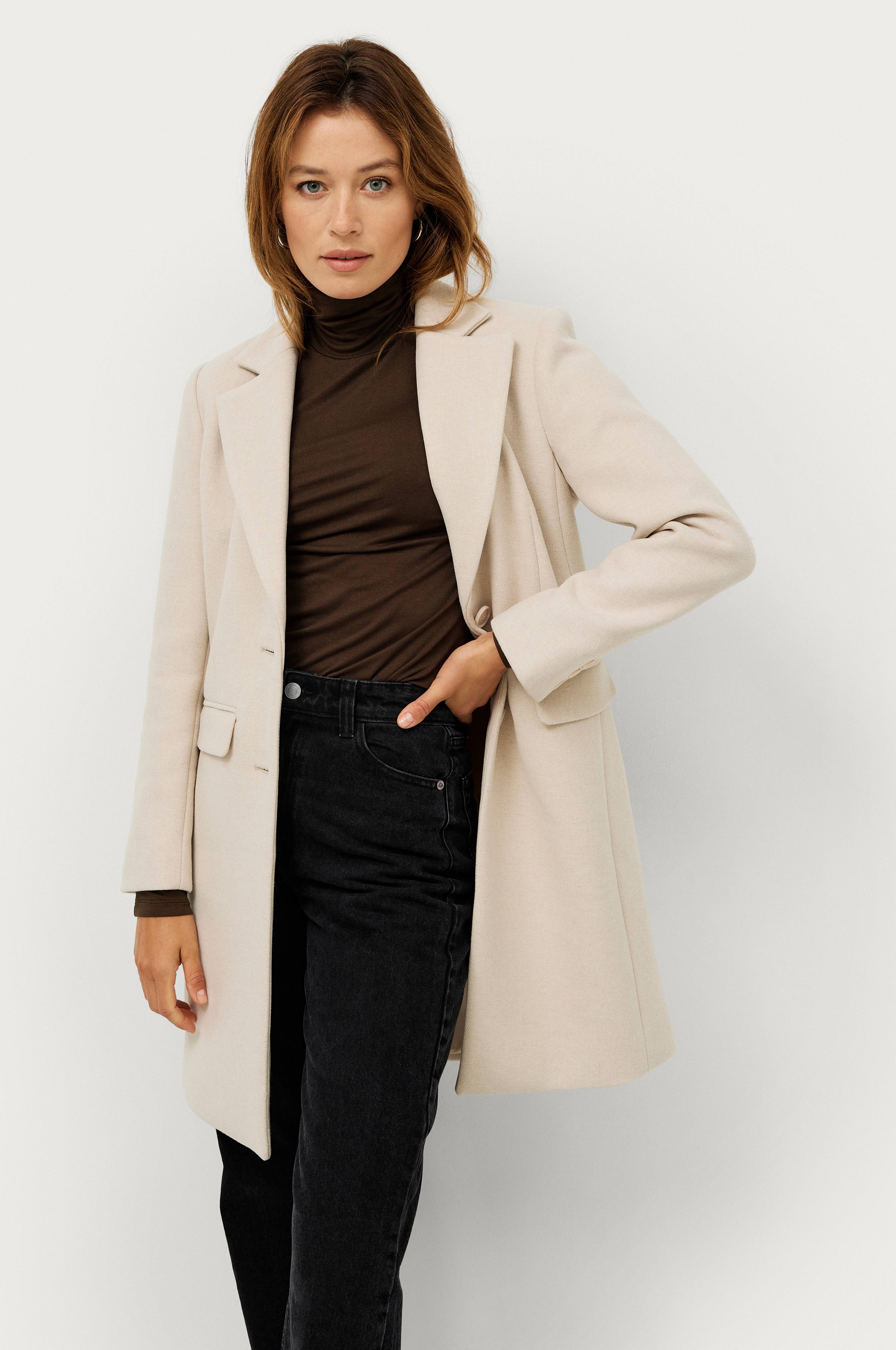 • Frakke i uldmiks• Filtet kvalitet• To knapper• To lommer• Tre dekorationsknapper ved manchetterne• Vævet, glat for• Længde: 89 cm i størrelse 36