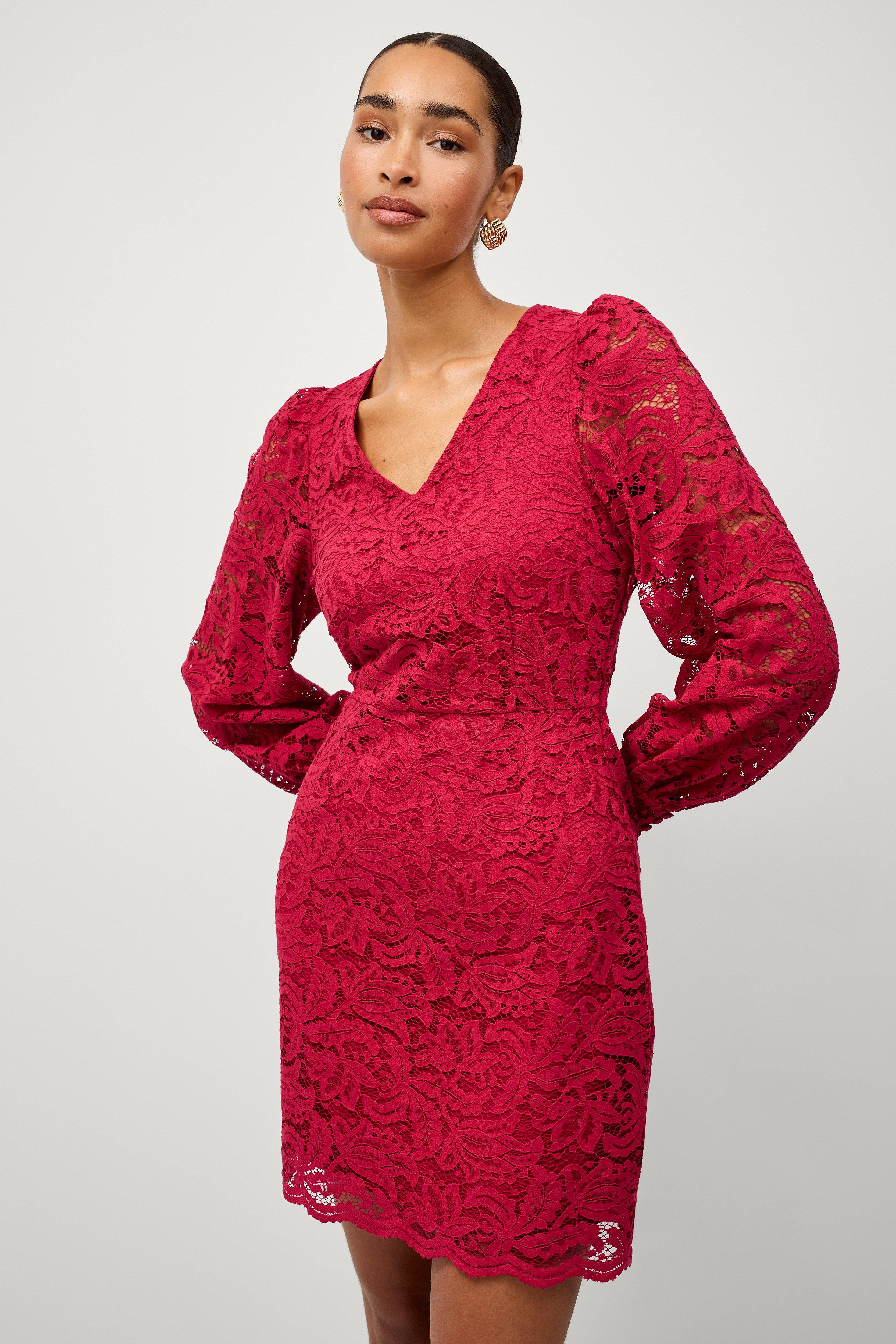 • Figurformede model i blonde • V-formet halsudskæring • Defineret talje • Langt ballonærme med manchet og beklædte knapper • Foret • Længde: 93 cm i størrelse 36