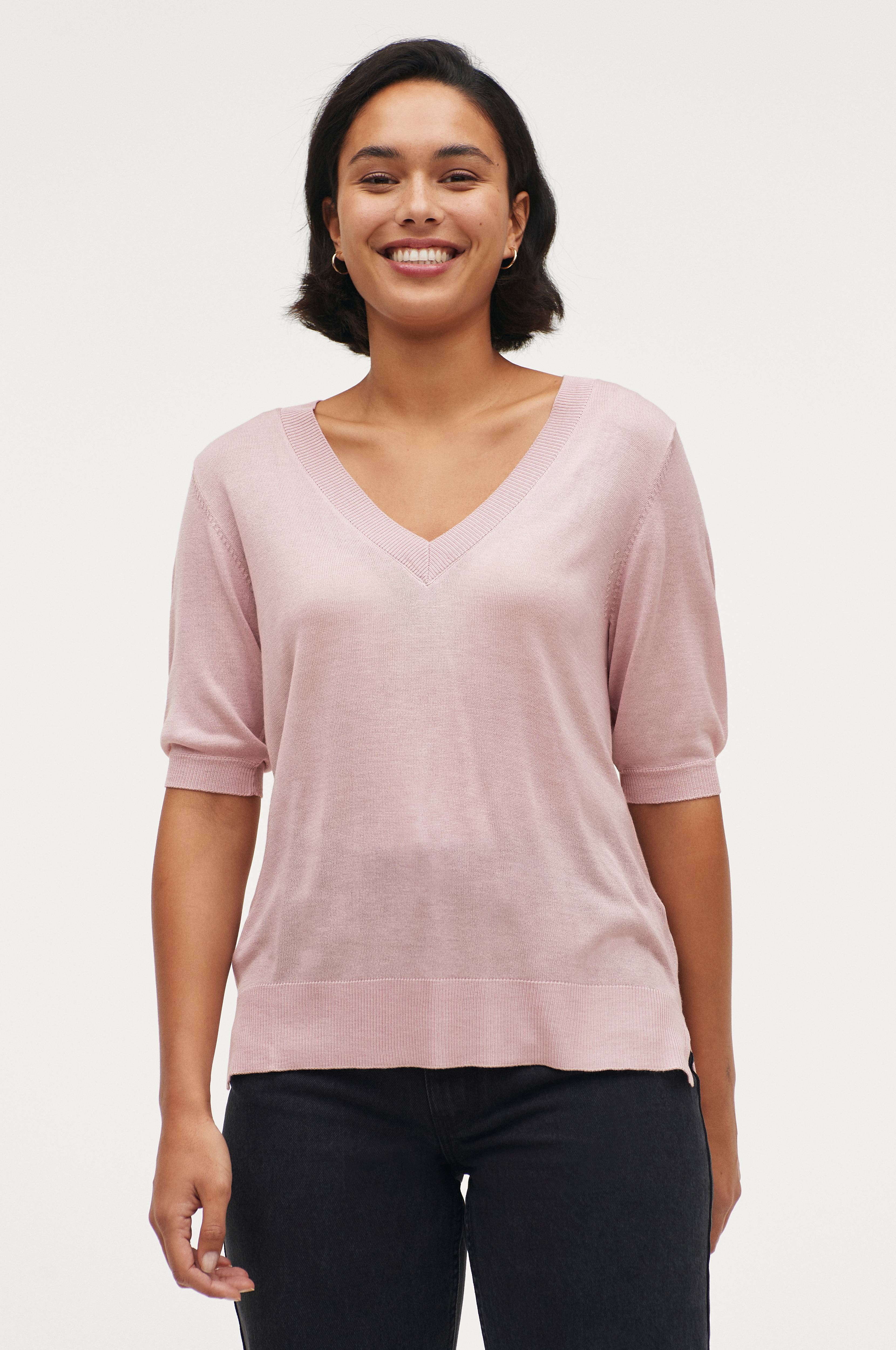 Top Frida i tynd, finstrikket model med V-formet halsudskæring som har bred ribkant. Kort ærme med ribstrik i ærmekant samt ribstrikket kant forneden med sideslids. Længde ca. 65 cm i str. 34/36.