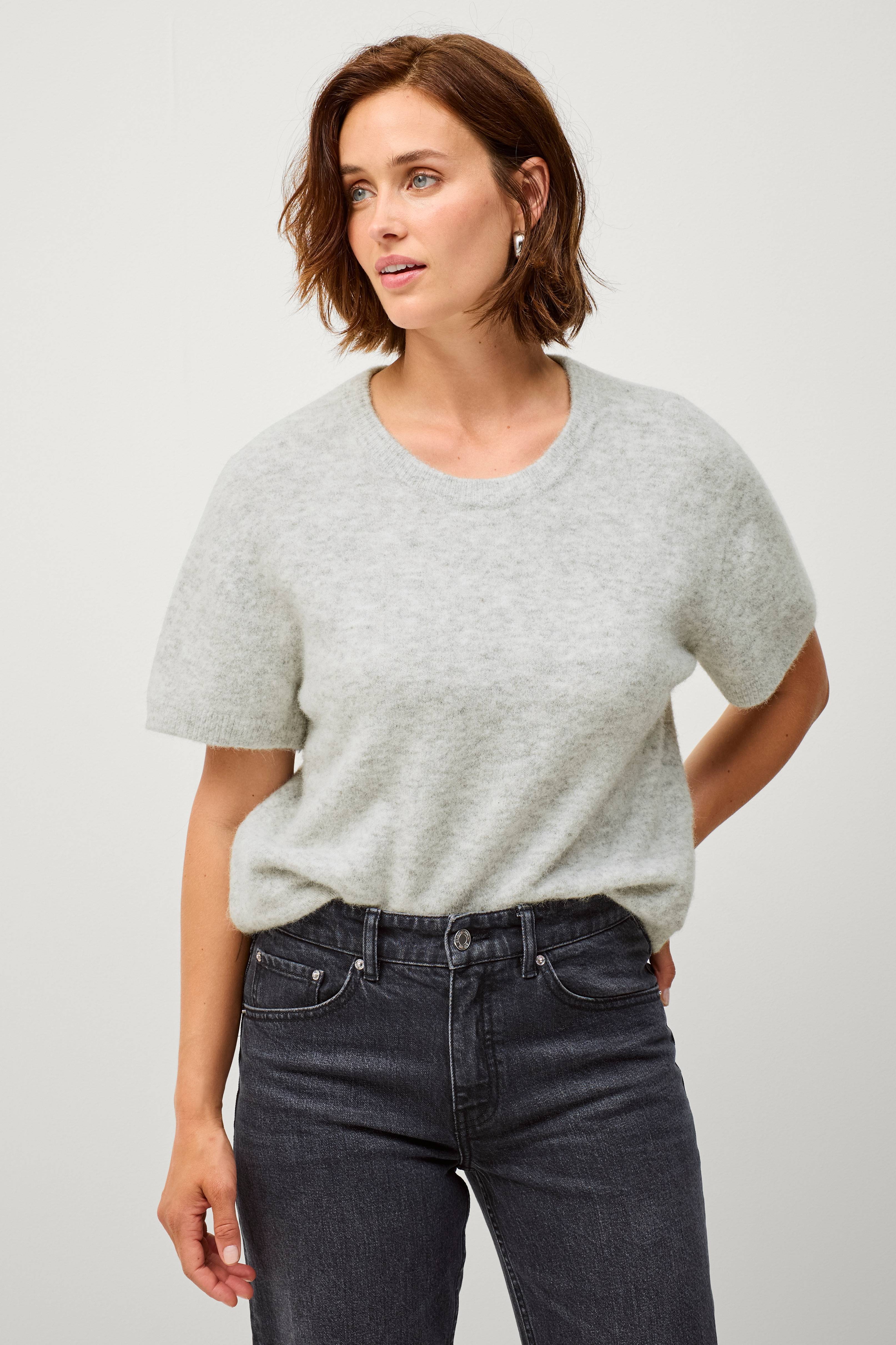 • Blød, fintstrikket model med lige pasform• Rund hals• Kort ærme• Ribstrikkede kanter• Længde: 59 cm i størrelse S