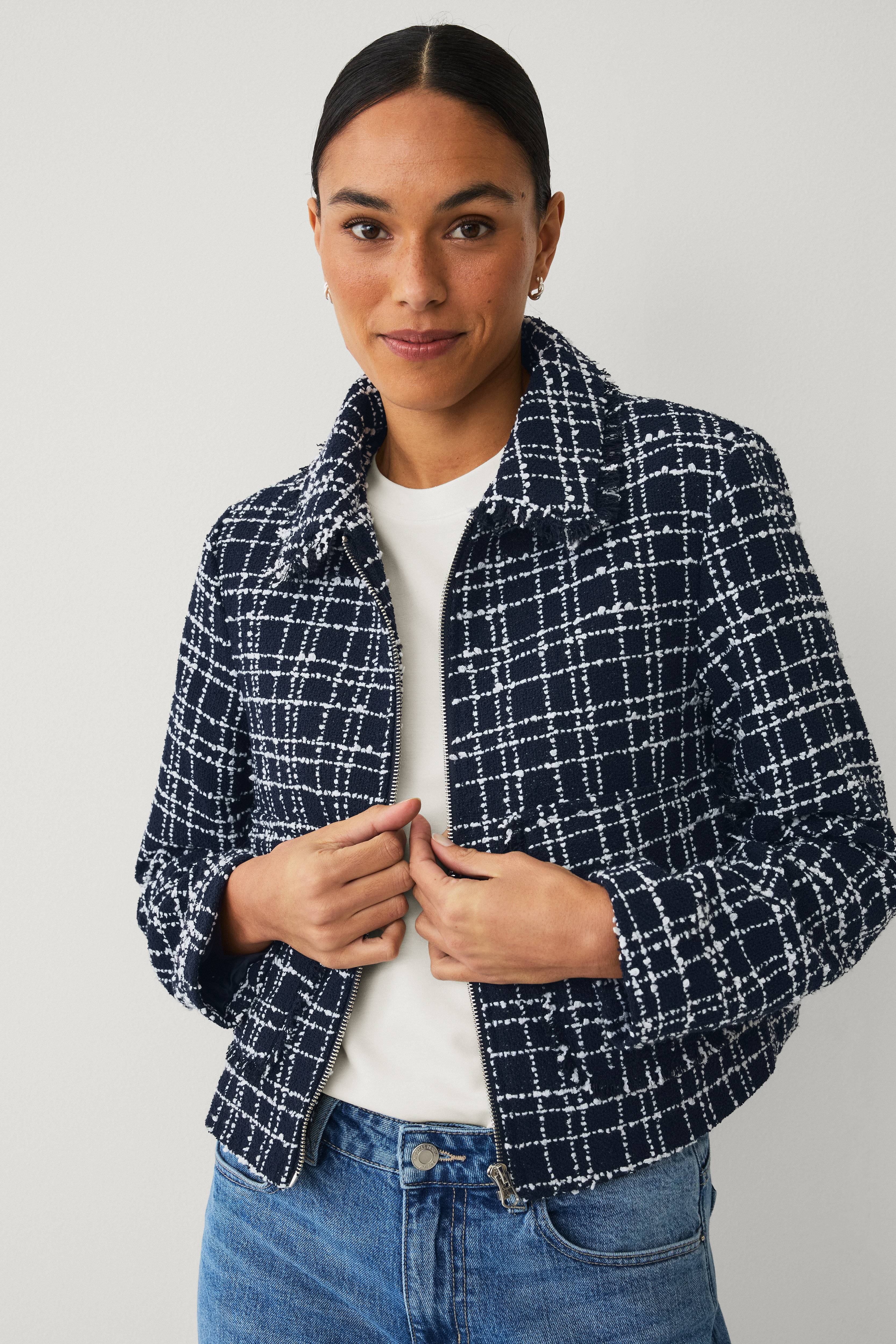 • Jakke i tweed• Krave• Lynlåslukning• Tekstilforing• To lommer med låg• Firkantet pasform• Længde: 51 cm i størrelse S