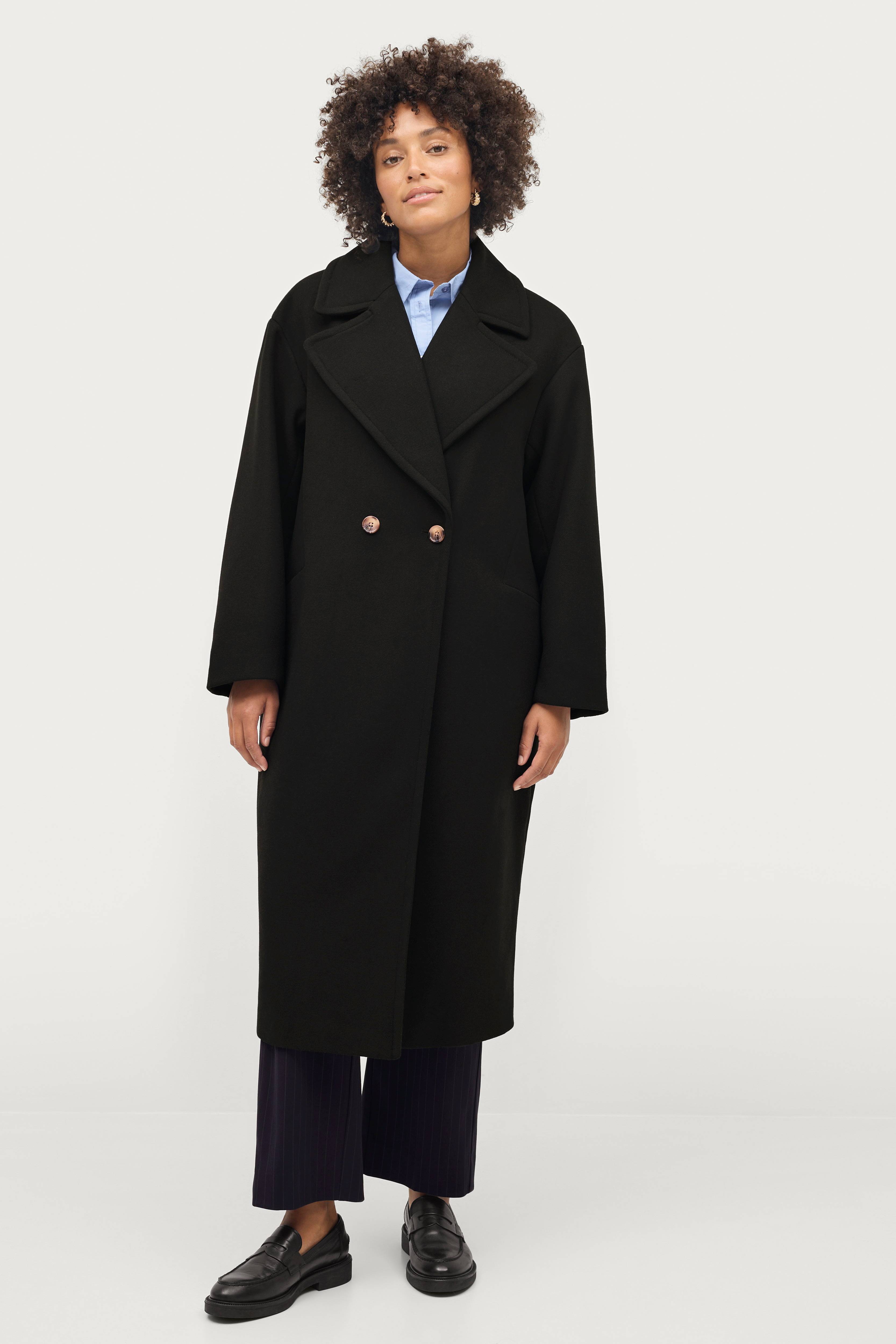 - Dobbeltradet frakke med stor revers- To lommer- Blød overflade- Vævet, glat for- Slids forneden bagpå- Længde: 119 cm i str. 38/40