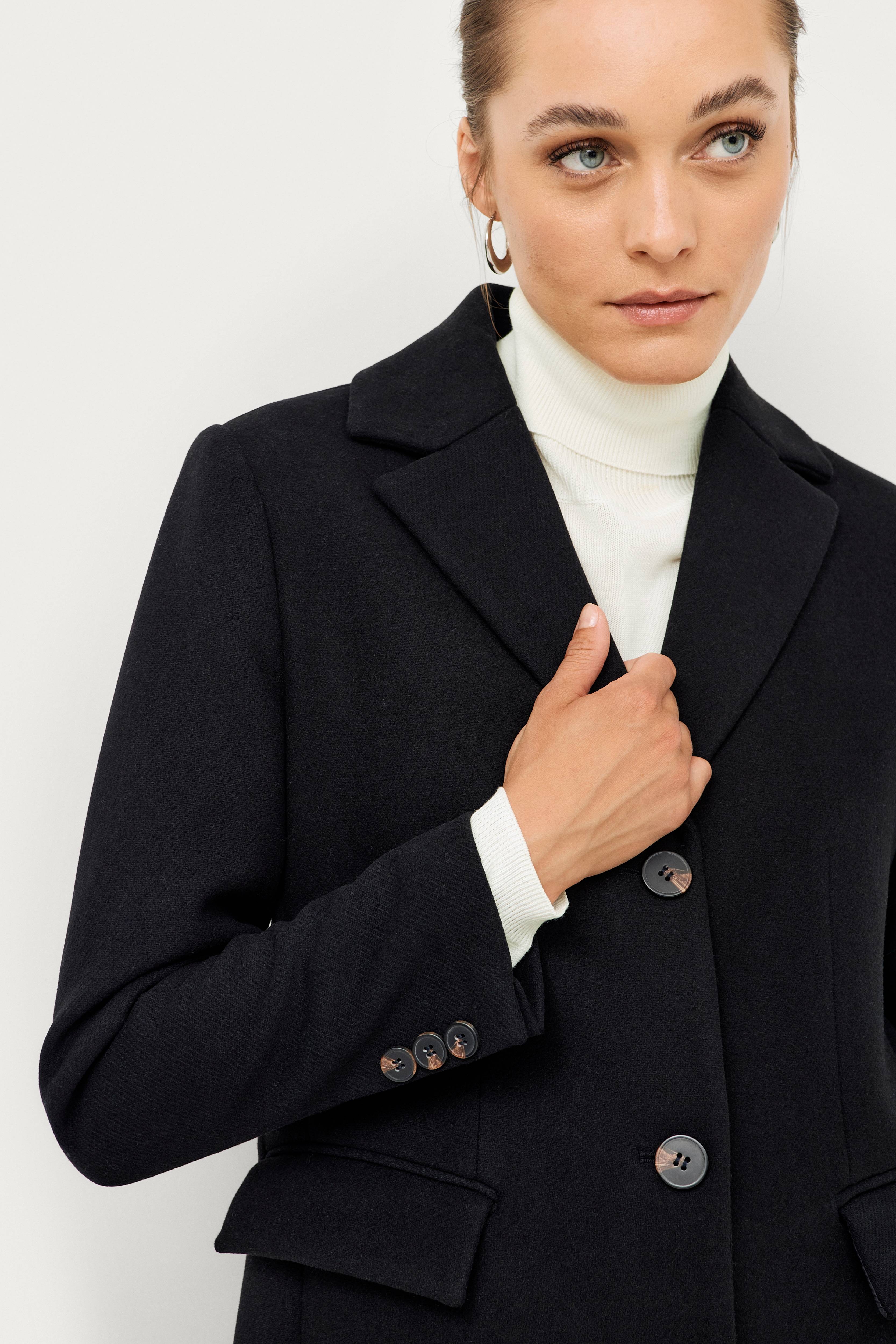Frakke Melina i klassisk, lige model i uldblanding med knapper foran og to lommer med lommeklap. Dekorative knapper i ærmekant samt slids i kant forneden bagpå. Længde ca. 89 cm i str. 36.