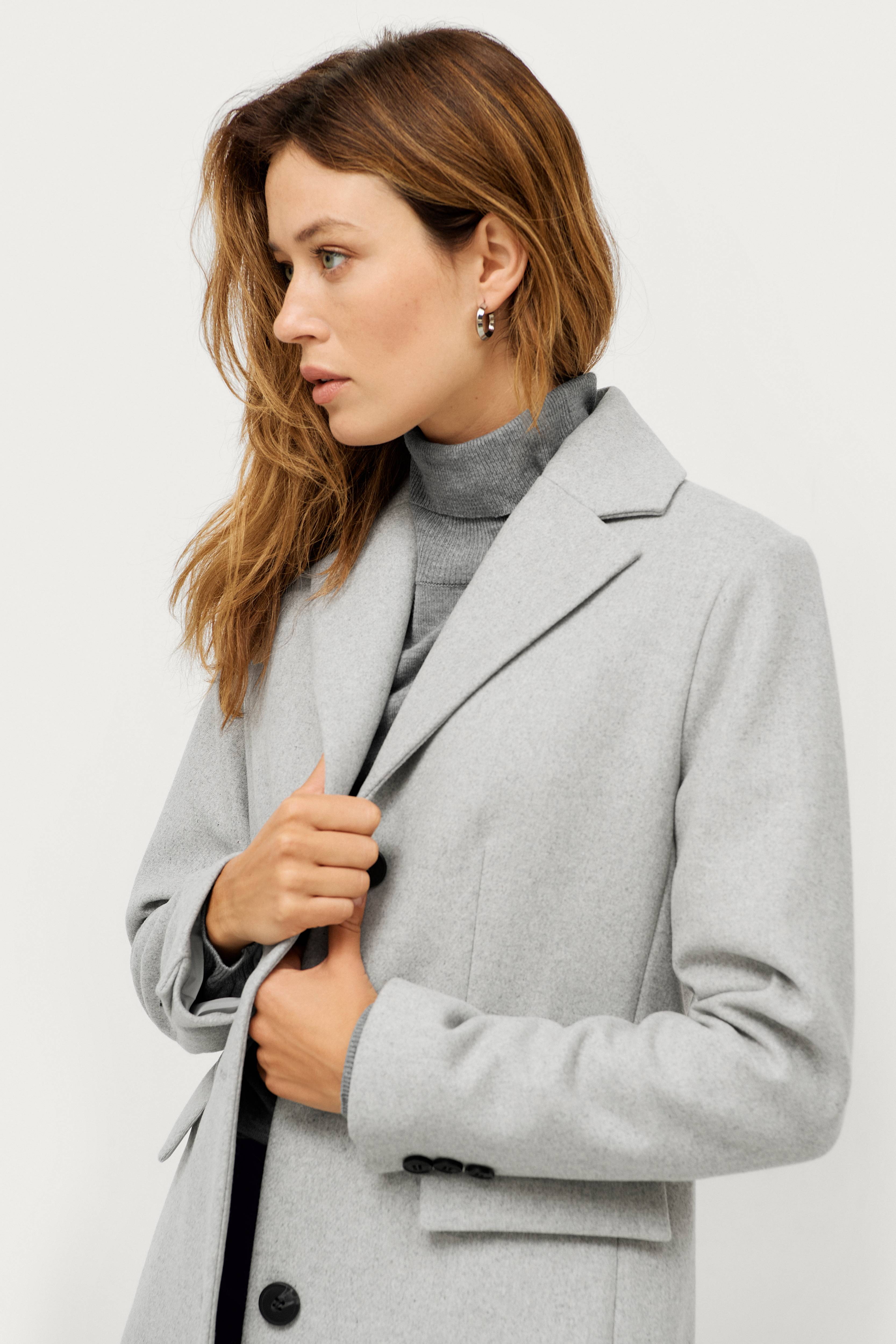 Frakke Melina i klassisk, lige model i uldblanding med knapper foran og to lommer med lommeklap. Dekorative knapper i ærmekant samt slids i kant forneden bagpå. Længde ca. 89 cm i str. 36.