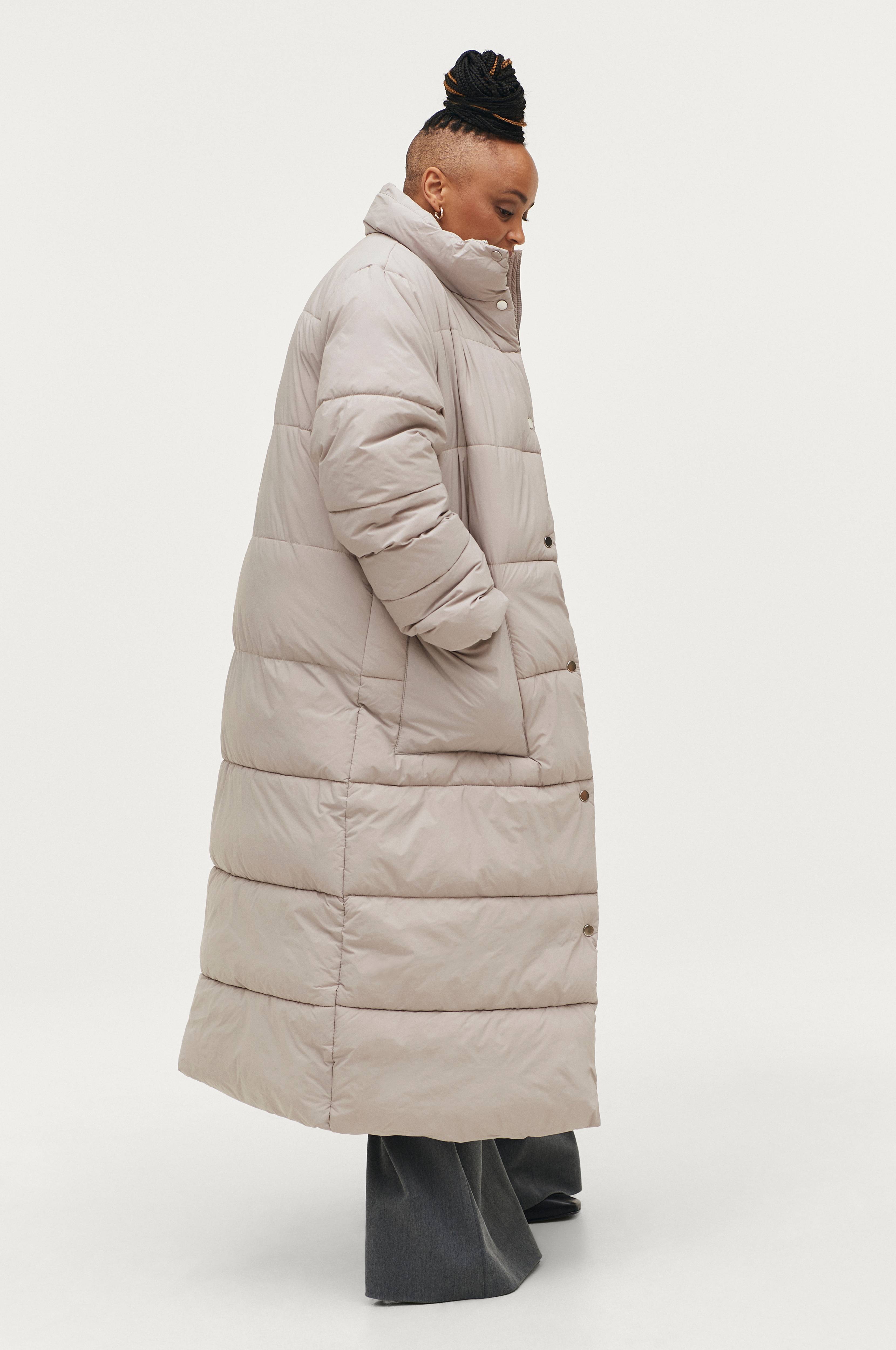 Lang vatteret frakke med oversizepasform. 2-vejslynlås og trykknapper foran. Fleeceforede lommer foran og skjult elastik i ærmekanterne. Vattering og for af genindvundet materiale. Længde ca. 119 cm i str. 34/36.