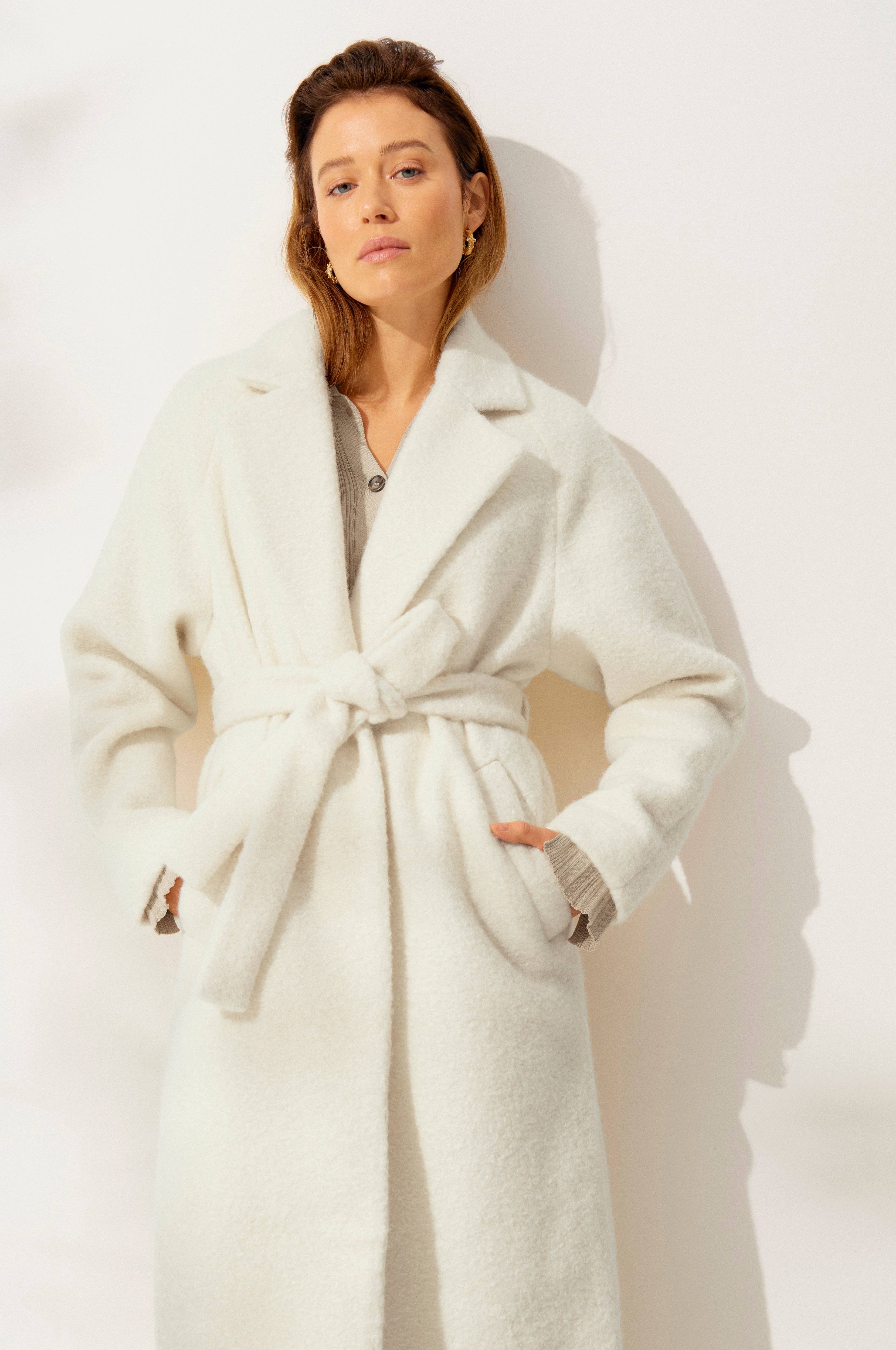 • Frakke med rummelig pasform• Blød børstet, uldlignende overflade• Lukning med skjulte trykknapper• Aftageligt bæltespænde ved taljen• To lommer• Længde: 124 cm i størrelse 34/36