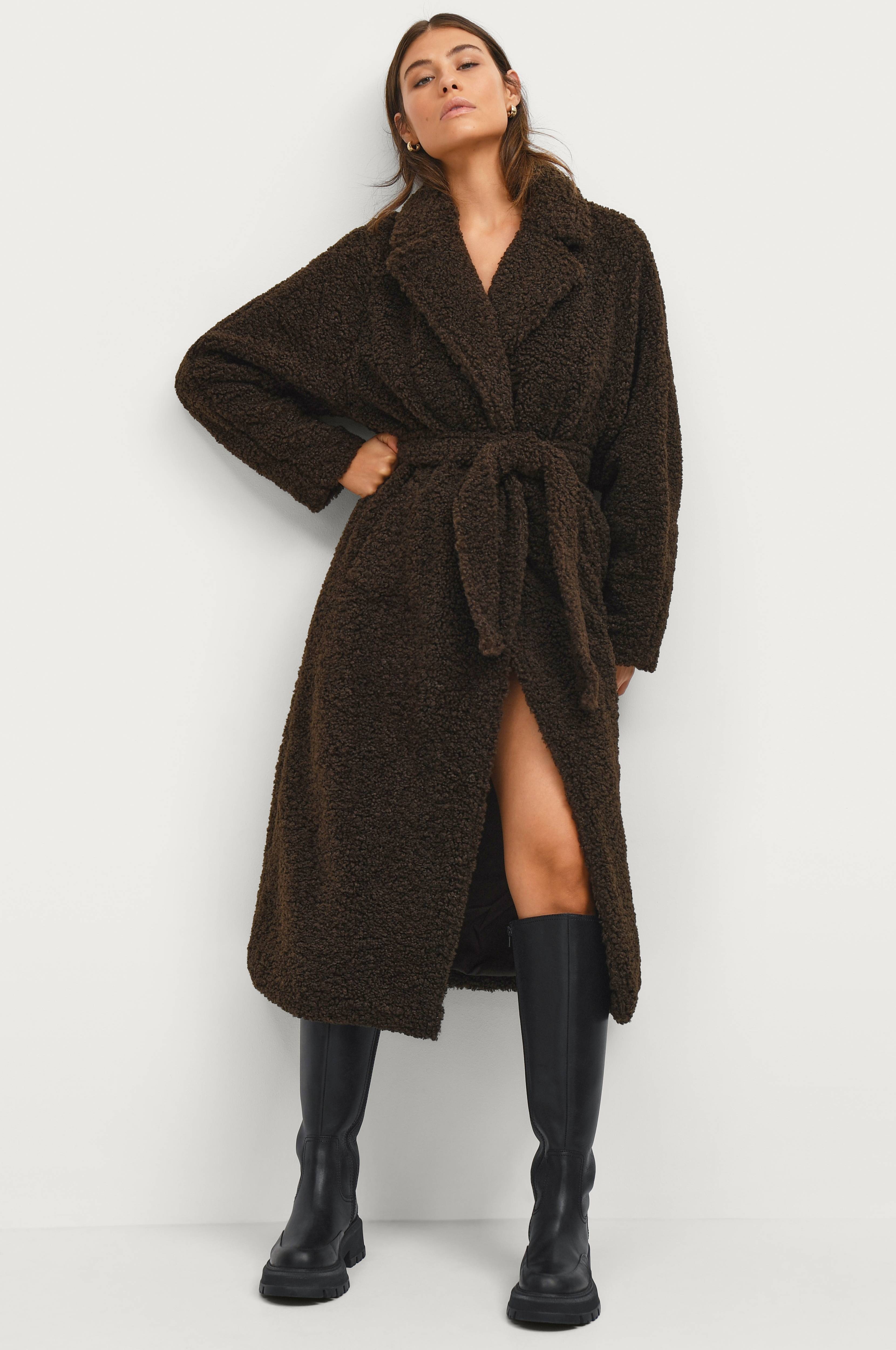 • Lang frakke i kunstskind• Skjulte trykknapper foran• Krave med revers• Lommer foran• Bindebælte ved taljen• Vævet for• Længde: 123 cm i størrelse 34/36